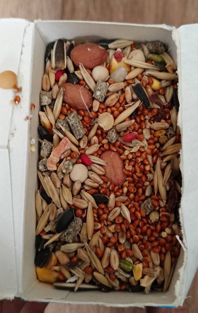 Хороший недорогой корм. Состав нормальный, есть и семечки и арахис и сушеные кусочки ягод попадаются