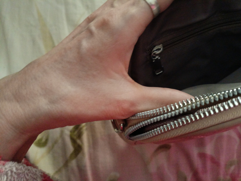 Отказ из-за отсутствия второго широкого ремешка. С пятнышками бы как-нибудь разобралась. И цвет не совсем бежевый, больше похож на чай с молоком, средний карман не пришит ко дну. Сшита добротно, выглядит хорошо, перезакажу.