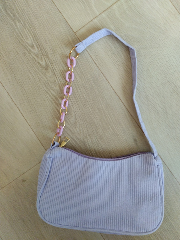цвет сумочки. и ручка-цепочка сиреневая. понравилась. дает некий шарм этой сумочке из сиреневого микровельвета.