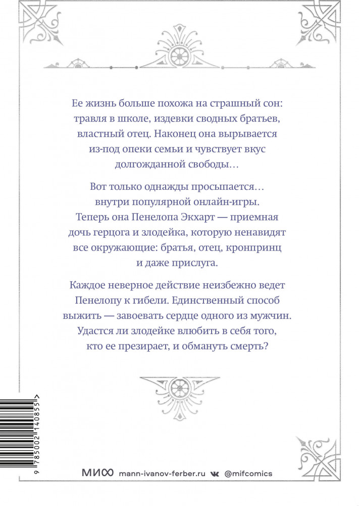 💳 Оплатить за товар можно при получении 🇰🇿 Есть бесплатная доставка по Казахстану от 1 дня 🎁 Копите бонусы с каждой покупки Серия: Единственный конец злодейки — смерть Это история девушки, которая становится сильной в невероятных обстоятельствах. Она живет обычной жизнью, сталкивается с проблемами, которые знакомы каждому: непонимание со стороны родителей, любовные переживания, одиночество. Пока однажды не просыпается Пенелопой Экхарт, главной злодейкой в популярной онлайн-игре — сильной, дерзкой и принципиальной. Все вокруг ее ненавидят, считают ничтожеством и желают смерти. Каждое неверное слово или поступок девушки — риск. Чтобы выжить, ей нужно завоевать симпатию одного из мужских персонажей. Однако это совсем не просто, ведь все они настроены против Пенелопы. Удастся ли ей обмануть саму смерть? |