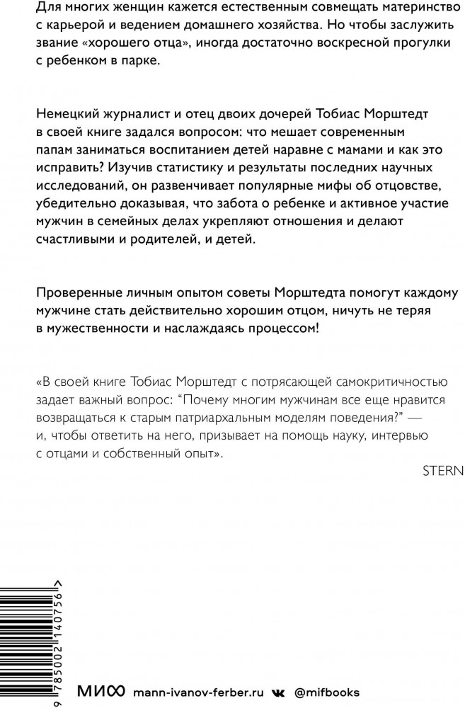 Немецкий журналист и отец двух дочерей Тобиас Морштедт в своей книге задался вопросом: что мешает современным папам заниматься воспитанием детей наравне с мамами, и как это исправить? Изучив статистику и результаты последних научных исследований, он развенчивает популярные мифы об отцовстве, убедительно доказывая, что забота о ребенке и активное участие мужчин в семейных делах укрепляют отношения и делают счастливыми и родителей, и детей.