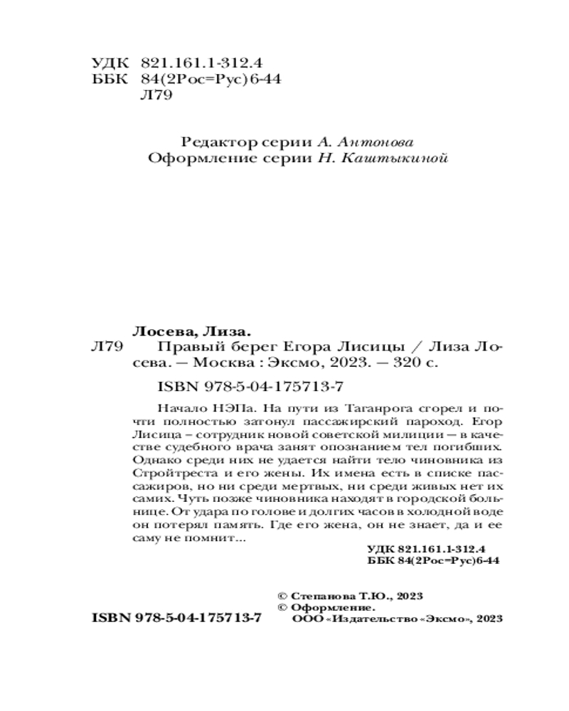 💳 Оплатить за товар можно при получении 🇰🇿 Есть бесплатная доставка по Казахстану от 1 дня 🎁 Копите бонусы с каждой покупки Серия: Ретро-детектив Лизы Лосевой (обложка) Начало НЭПа. На пути из Таганрога сгорел и почти полностью затонул пассажирский пароход. Егор Лисица — сотрудник новой советской милиции — в качестве судебного врача занят опознанием тел погибших. Однако среди них не удается найти тело чиновника из Стройтреста и его жены. Их имена есть в списке пассажиров, но ни среди мертвых, ни среди живых нет их самих. Чуть позже чиновника находят в городской больнице. От удара по голове и долгих часов в холодной воде он потерял память. Где его жена, он не знает, да и ее саму не помнит... |
