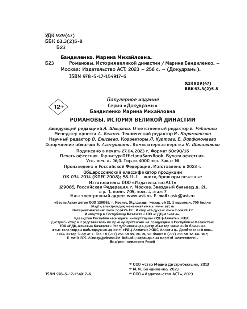 💳 Оплатить за товар можно при получении 🇰🇿 Есть бесплатная доставка по Казахстану от 1 дня 🎁 Копите бонусы с каждой покупки Серия: Докудрамы «Романовы. История великой династии» — книга, которая открывает дверь в мир великолепия, интриг и роскоши и раскрывает тайны одной из самых влиятельных и загадочных династий, которая определила судьбу России и оставила неизгладимый след в истории человечества. Вы познакомитесь с удивительными личностями, такими как Петр I или Павел III, и узнаете, как именно они творили историю. |