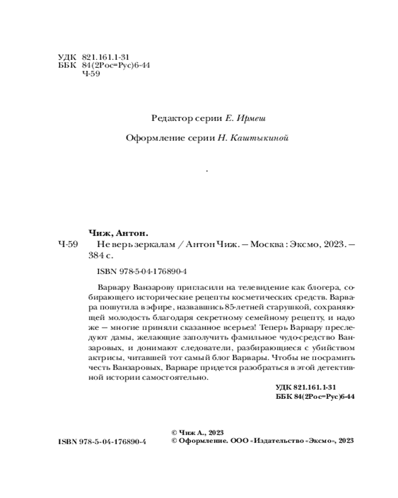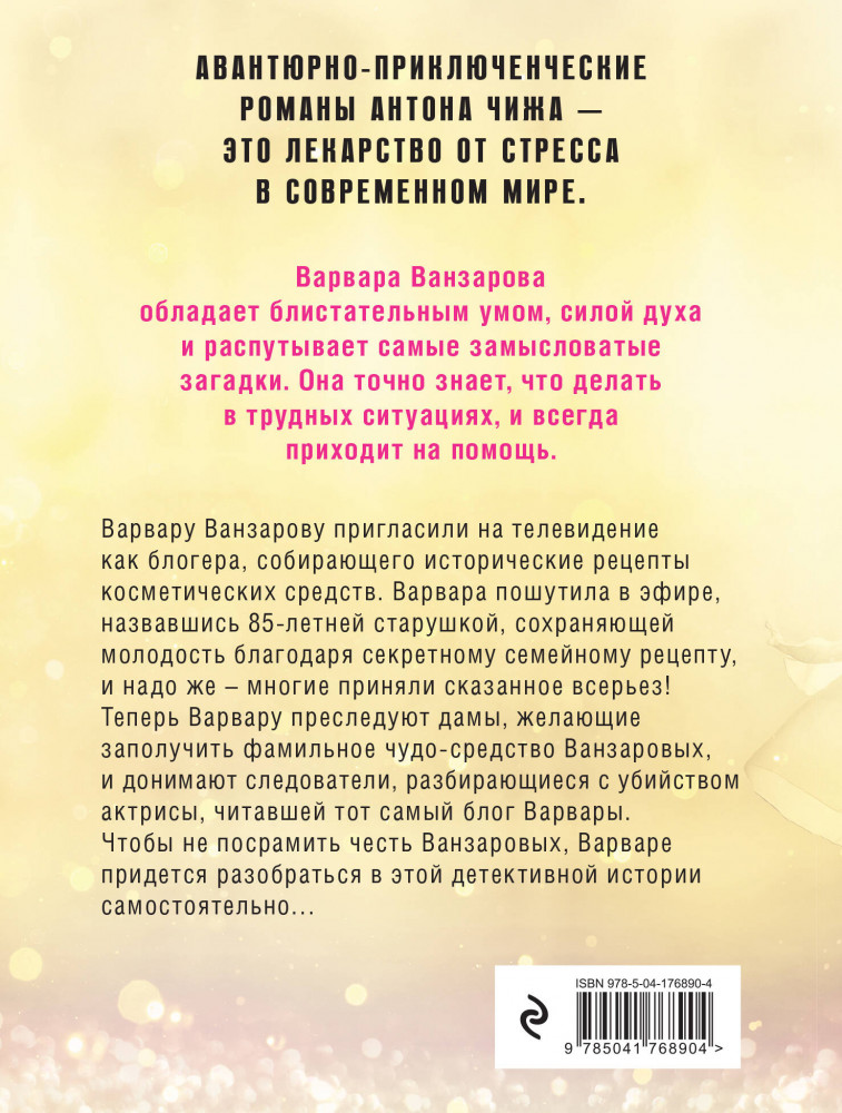 В данный момент этот товар отсутствует в продаже. Возможно, у нас найдется аналогичный или похожий товар здесь. Серия: Антон Чиж: Авантюрно-приключенческий детектив о Варваре Ванзаровой (обложка) Варвару Ванзарову пригласили на телевидение как блогера, собирающего исторические рецепты косметических средств. Варвара пошутила в эфире, назвавшись 85-летней старушкой, сохраняющей молодость благодаря секретному семейному рецепту, и надо же — многие приняли сказанное всерьез! Теперь Варвару преследуют дамы, желающие заполучить фамильное чудо-средство Ванзаровых, и донимают следователи, разбирающиеся с убийством актрисы, читавшей тот самый блог Варвары. Чтобы не посрамить честь Ванзаровых, Варваре придется разобраться в этой детективной истории самостоятельно...