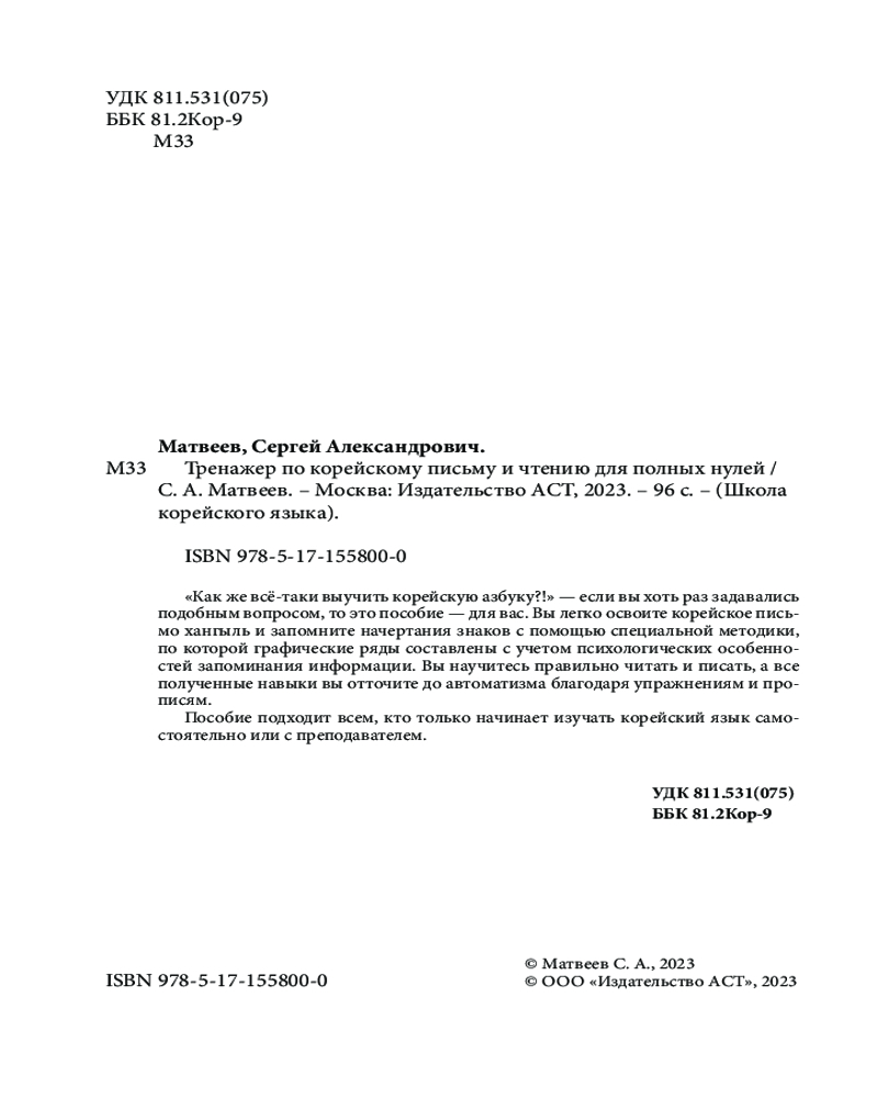 💳 Оплатить за товар можно при получении 🇰🇿 Есть бесплатная доставка по Казахстану от 1 дня 🎁 Копите бонусы с каждой покупки Серия: Школа корейского языка «Как же всё-таки выучить корейскую азбуку?!» — если вы хоть раз задавались подобным вопросом, то это пособие — для вас. Вы легко освоите корейское письмо хангыль и запомните начертания знаков с помощью специальной методики, по которой графические ряды составлены с учетом психологических особенностей запоминания информации. Вы научитесь правильно читать и писать, а все полученные навыки вы отточите до автоматизма благодаря упражнениям и прописям. Пособие подходит всем, кто только начинает изучать корейский язык самостоятельно или с преподавателем. |