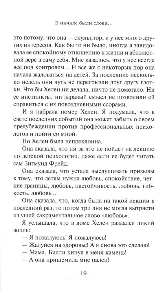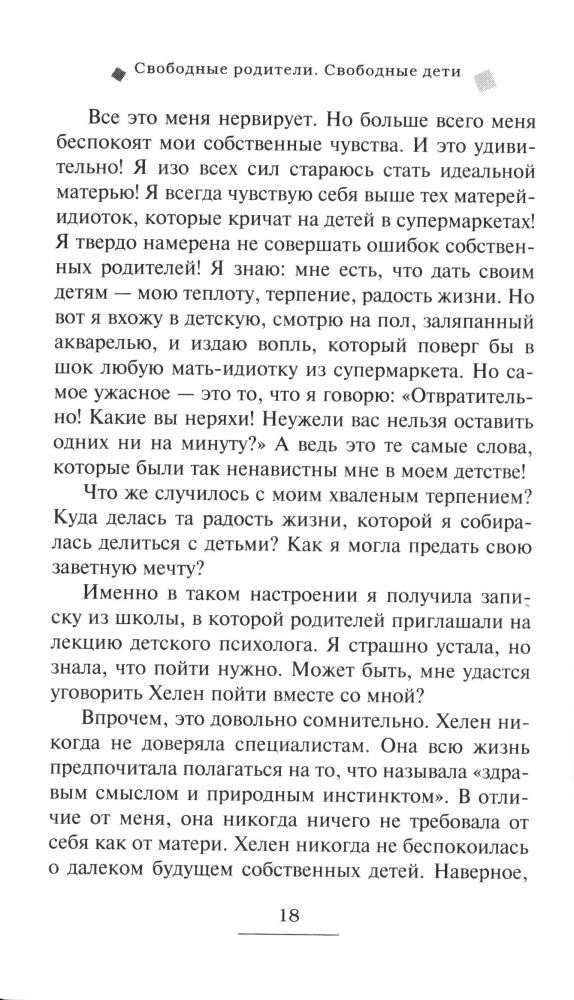 Книгу наконец дочитала, и могу оставить свой отзыв. Мое впечатление от книги очень положительное. Книга читается легко, подача материала в виде истории, как одна женщина и другие жители в ее городке посещали занятия некоего доктора Гиннота. Показываются ситуации с детьми, как автор и ее знакомые, посещающие занятия психолога, выходили из положения в отношениях с детьми. Книга мотивирует задуматься. Но возможно, не всем она может подойти. В книге рекомендации как-то расплывчаты, на мой взгляд. В таком случае, лучше взять книгу Гиппенрейтер, у нее все четко и ясно. Эти книги между собой перекликаются, и у Гиппенрейтер все-таки четко расписаны методы решения в затруднительных отношениях с детьми. Но как дополнение примеров к общей схеме поведения и отношения к детям, дополнение к литературе о воспитании детей (=родителей) будет очень кстати.