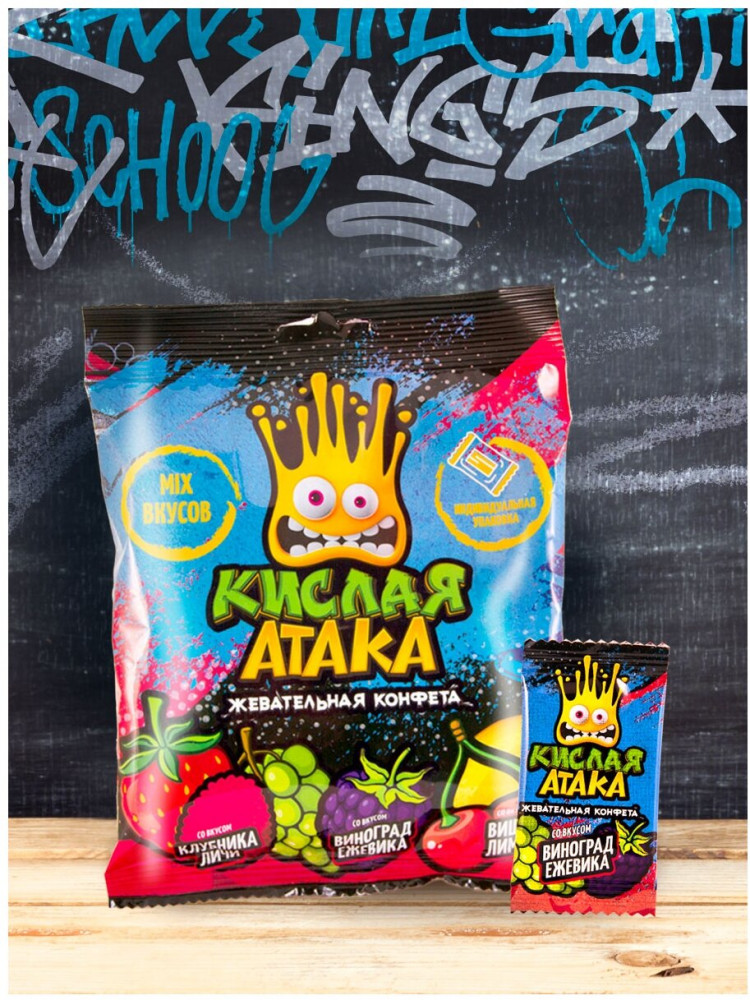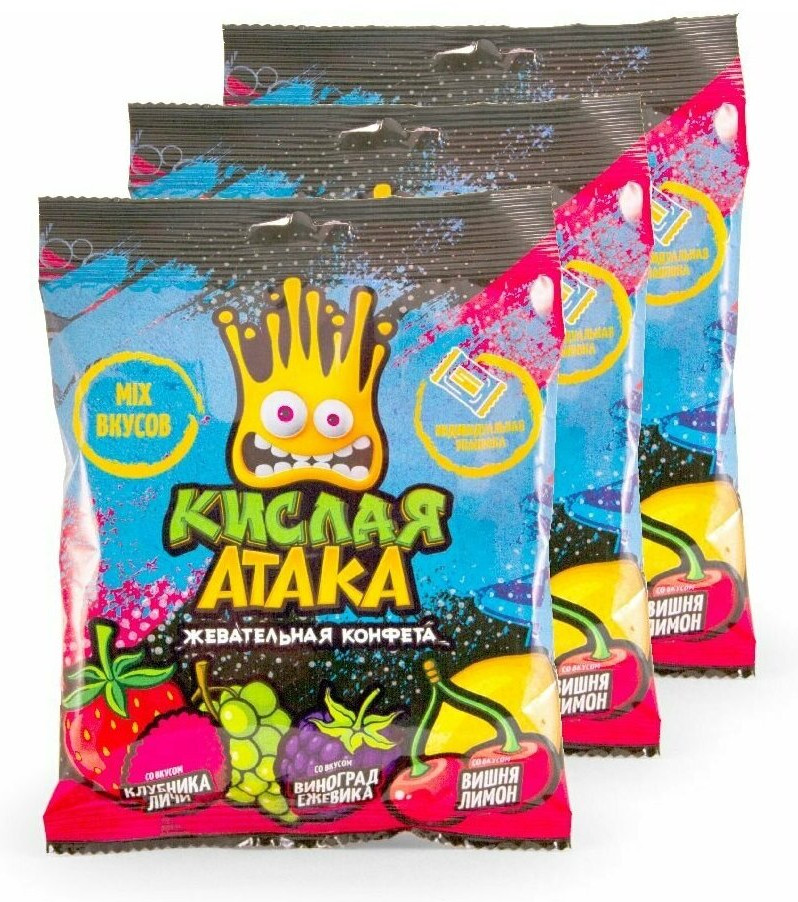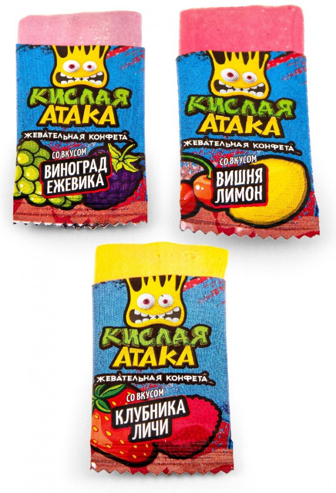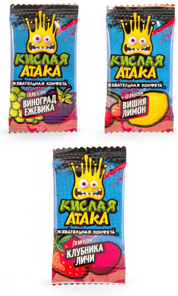 💳 Оплатить за товар можно при получении 🇰🇿 Есть бесплатная доставка по Казахстану от 1 дня 🎁 Копите бонусы с каждой покупки Для жевательных мини-конфет «Кислая атака» было разработано три кислых фруктово-ягодных микса: клубника-личи, виноград-ежевика и вишня-лимон. Продукт производится на нашей фабрике «МАК-Иваново» с использованием натуральных ароматизаторов и красителей, таких как каротин и экстракт чёрной моркови. Не содержит трансжиры. Упаковка, выполненная в узнаваемом стиле уличного стрит-арта, стала ещё более яркой и привлекающей внимание. Это по-настоящему сочные, взрывные цвета, изображение больших фруктов в красочной рисовке и жёлтой рожицы, которая выражает весь спектр взрывных эмоций от неожиданно-кислого вкуса, в 3D. Такая упаковка привлечёт внимание не только детей, но и подростков, молодёжи и взрослых людей, которым не чуждо внутреннее хулиганство. Каждая жевательная конфета в пакете упакована в красочную индивидуальную плёнку с изображением логотипа бренда и соответствующих вкусу фруктов. |