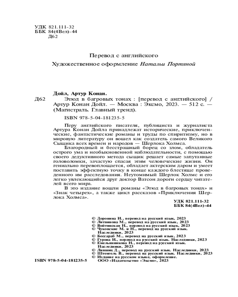 В это издание вошли романы «Этюд в багровых тонах» и «Знак четырех», а также цикл рассказов «Приключения Шерлока Холмса». |