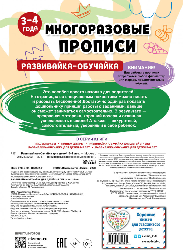 💳 Оплатить за товар можно при получении 🇰🇿 Есть бесплатная доставка по Казахстану от 1 дня 🎁 Копите бонусы с каждой покупки Серия: Мои первые многоразовые прописи Многоразовые прописи для детей 3-4 лет — уникальное пособие, которого хватит надолго! Дошкольник сможет писать и рисовать в тетради маркером или фломастером сколько угодно раз, а потом сам стирать написанное салфеткой. Выполняя увлекательные игровые задания, он не только разовьет мелкую моторику, но и научится считать до пяти, запомнит цифры и печатные буквы русского алфавита, геометрические фигуры, разовьет внимание, логическое мышление. Размер пособия — немного больше ученической тетради и, по мнению психологов, идеален для детских занятий. Прописи не боятся воды и устойчивы к механическим воздействиям. Их удобно брать с собой в дорогу. Пособие станет любимой игрушкой вашего ребенка, он не захочет выпускать его из рук. |