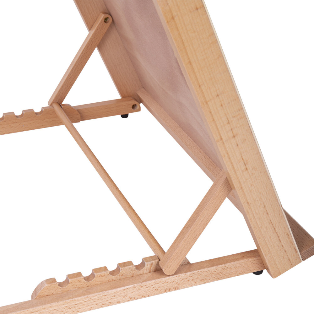💳 Оплатить за товар можно при получении 🇰🇿 Есть бесплатная доставка по Казахстану от 1 дня 🎁 Копите бонусы с каждой покупки Серия: Classic Современный мольберт — это особая конструкция из дерева, металла или древесно-стружечного материала, которая помогает вертикально или под некоторым углом располагать материал для работы художника. Настольный планшетный мольберт изготовлен из натурального бука, пропитанного маслом. Мольберт с регулируемым углом наклона отлично подходит для работы с малыми и средними форматами, максимальный размер бумаги — А3. Планшет мольберта представляет собой жесткую основу, за счет этого на мольберте легко можно закрепить бумагу малярным скотчем или зажимами. Поверхность планшета хорошо отшлифована и подходит даже для тонкой бумаги. 5 вариантов наклона мольберта помогут найти удобное положение для творчества. Мольберт удобно хранить в сложенном виде. |