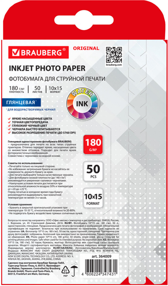 Глянцевая односторонняя фотобумага Brauberg подходит для всех типов струйных принтеров. Незаменима для печати ярких фотореалистичных изображений. Передает яркие, насыщенные цвета со множеством оттенков. Гладкая поверхность обеспечивает превосходное качество, а особый состав — идеальную цветопередачу. Печать возможна только водорастворимыми чернилами. Поставляется по 50 листов в картонной упаковке с европодвесом.