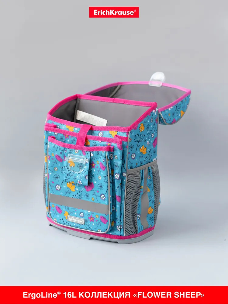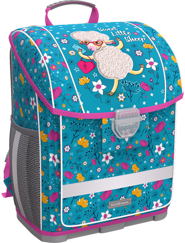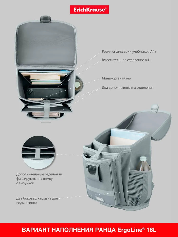 Жёстко-каркасный ранец с эргономичной спинкой и грудной перемычкой. Весит 830 грамм без дополнительной фурнитуры — один из самых лёгких в категории. Три отделения: основное вместительное с эластичным фиксатором для тетрадей и учебников формата А4+ и два дополнительных с мини-органайзером для канцелярских принадлежностей. Снаружи два боковых кармана на резинке для бутылки с водой или зонтика.
