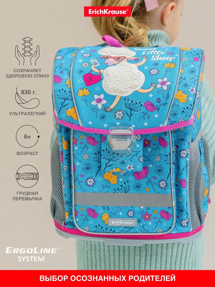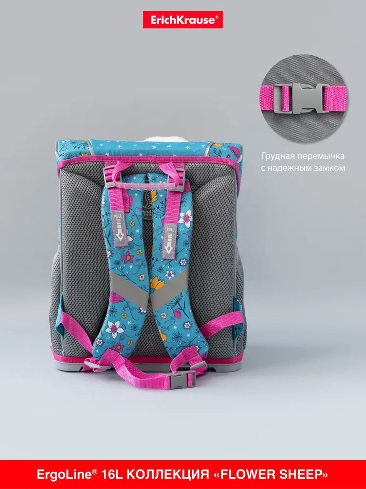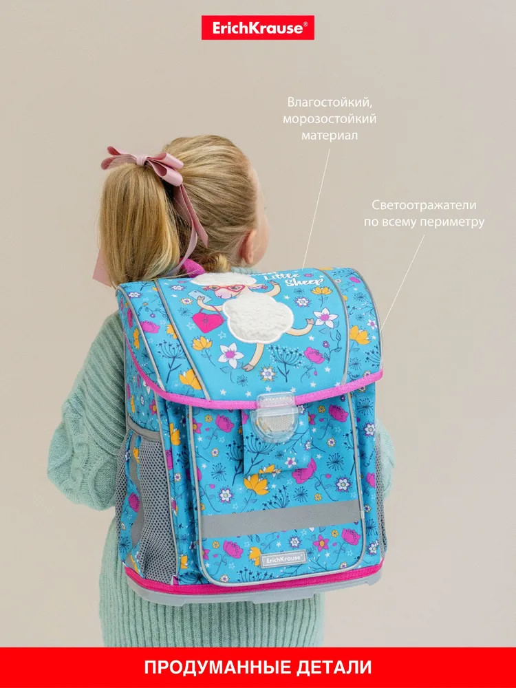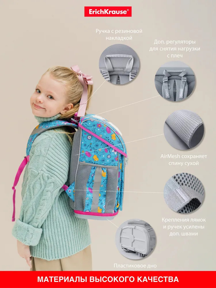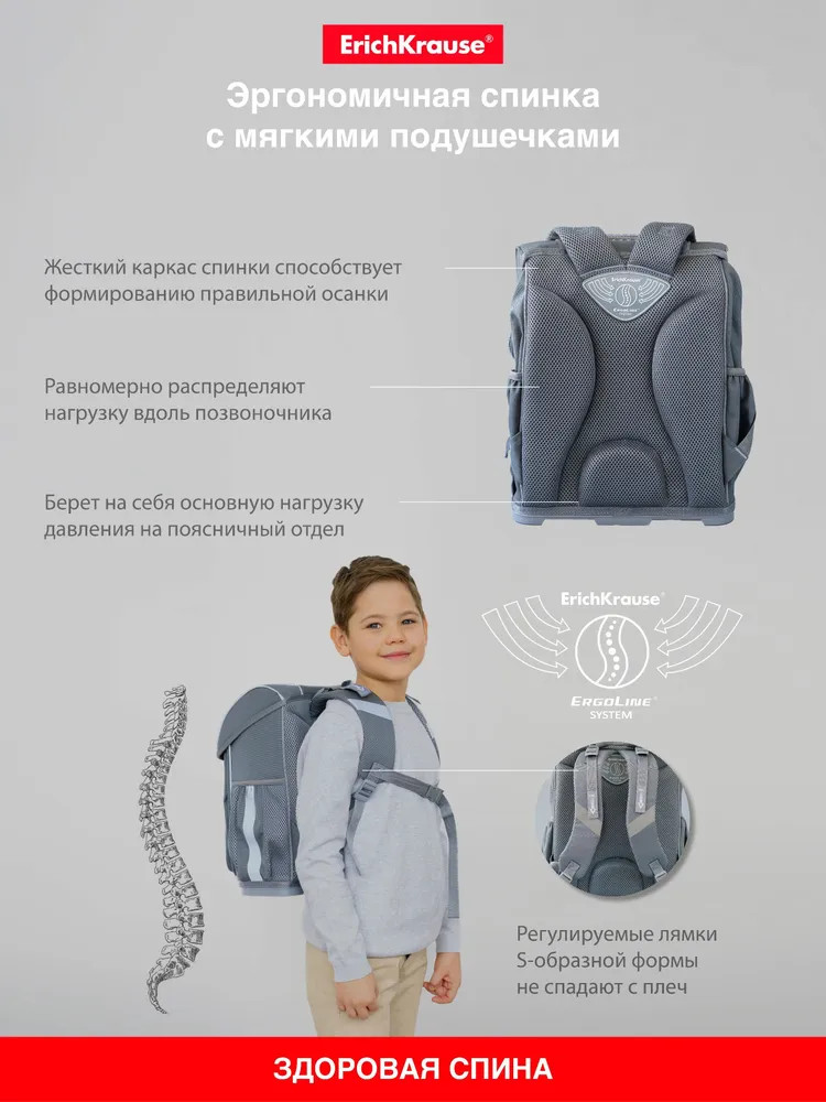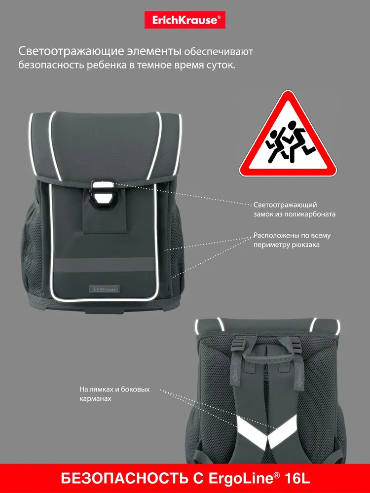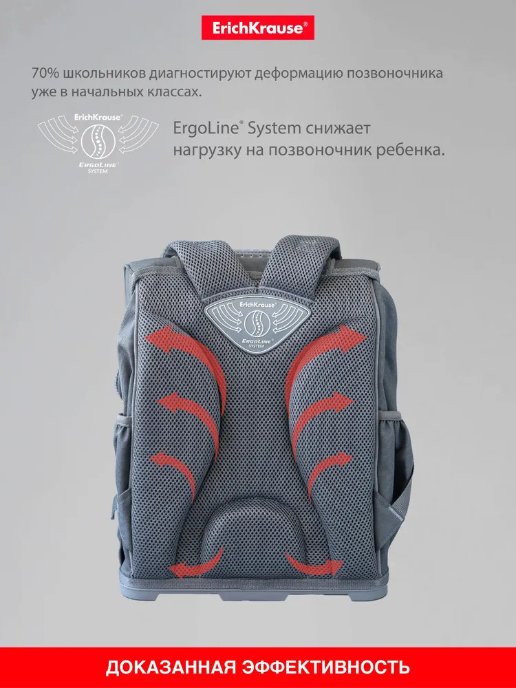 Эргономичная конструкция спинки ErgoLine System из мягких подушечек распределяет вес ранца и снижает нагрузку на позвоночник ребёнка. «Дышащая» ткань AirMesh и воздушные каналы между подушечками спинки препятствуют образованию влаги. Мягкие S-образные лямки не давят на плечи. Светоотражающие элементы по всему периметру ранца. Ручка с резиновой накладкой для переноски в руке. Крепления ручки и лямок усилены дополнительными швами из лавсановых нитей. 100% полиэстер Оксфорд с полиуретановой пропиткой устойчив к износу и морозу. Литое дно из ударопрочного пластика защищает от загрязнений и влаги.