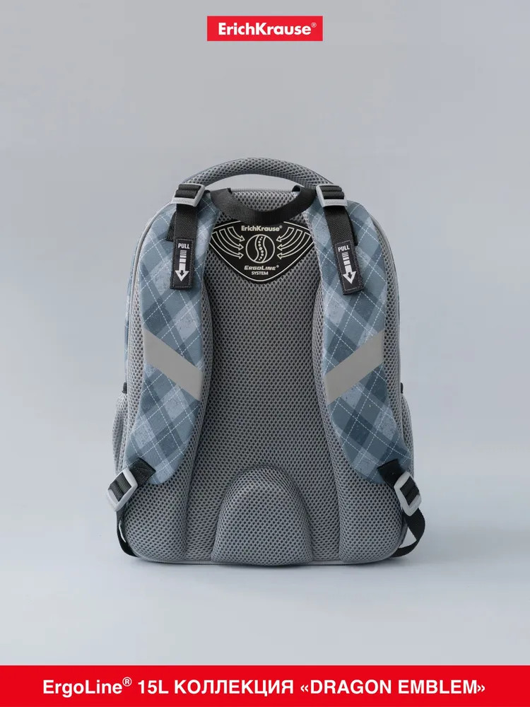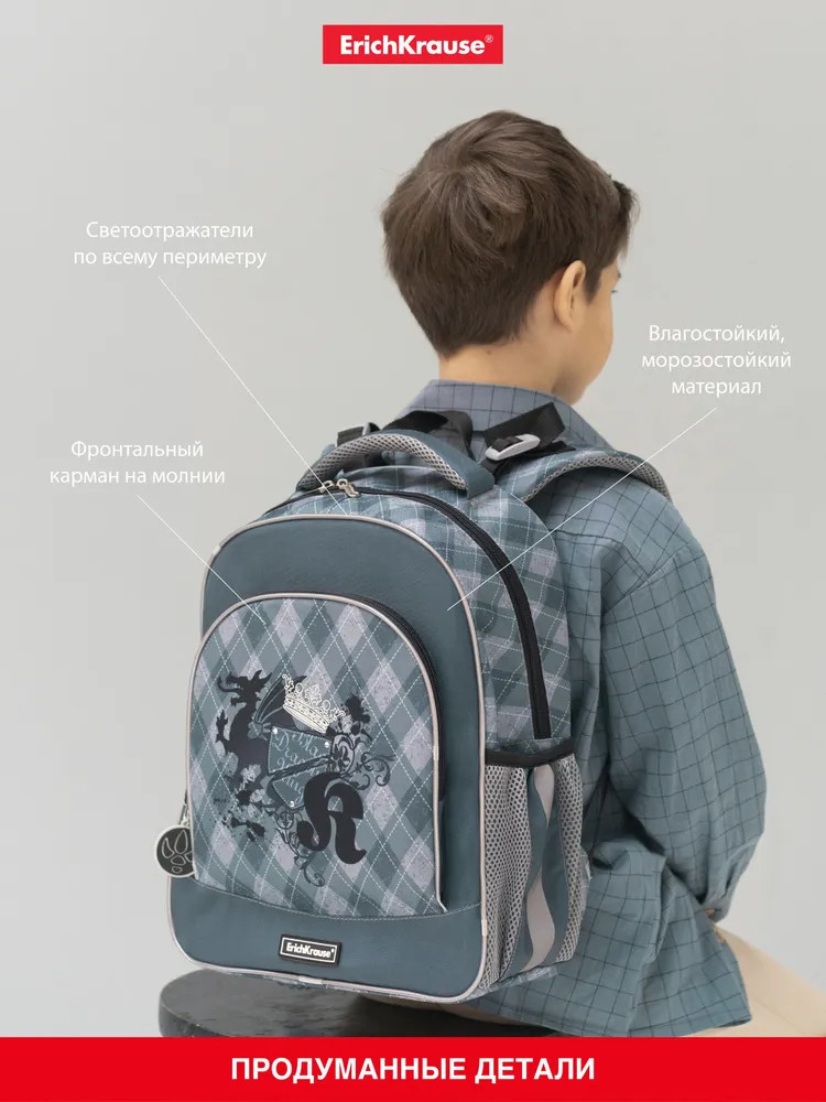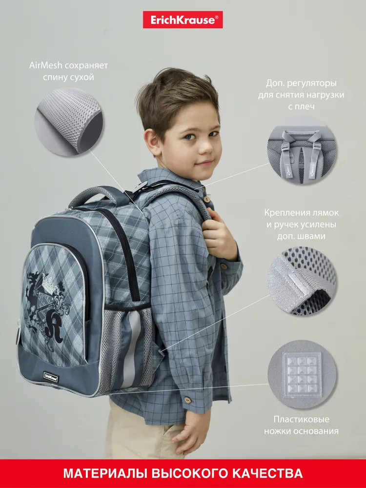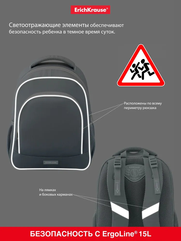 Эргономичная конструкция спинки ErgoLine System из мягких подушечек распределяет вес рюкзака и снижает нагрузку на позвоночник ребёнка. «Дышащая» ткань AirMesh и воздушные каналы между подушечками спинки препятствуют образованию влаги. Мягкие S-образные лямки не давят на плечи. Светоотражающие элементы по всему периметру рюкзака. Мягкая объёмная ручка для переноски в руке. Крепления ручки и лямок усилены дополнительными швами из лавсановых нитей. 100% полиэстер оксфорд с полиуретановой пропиткой устойчив к износу и морозу. Пластиковые ножки защищают от загрязнений и влаги.