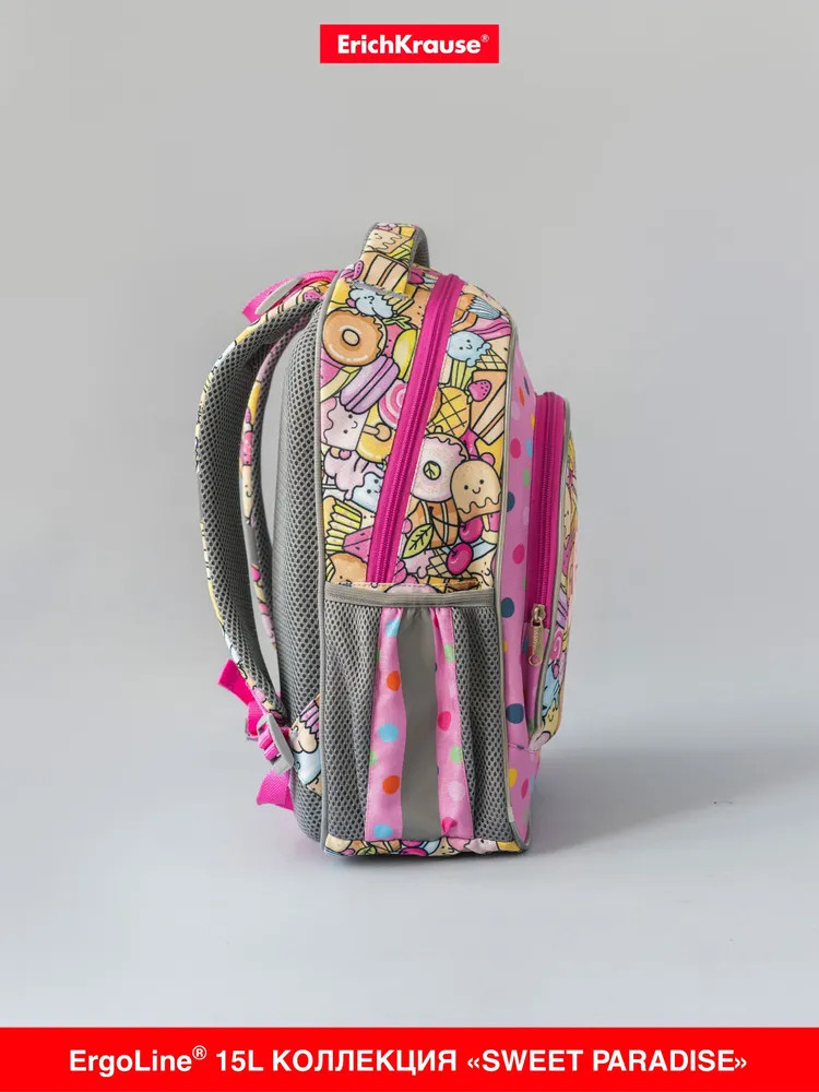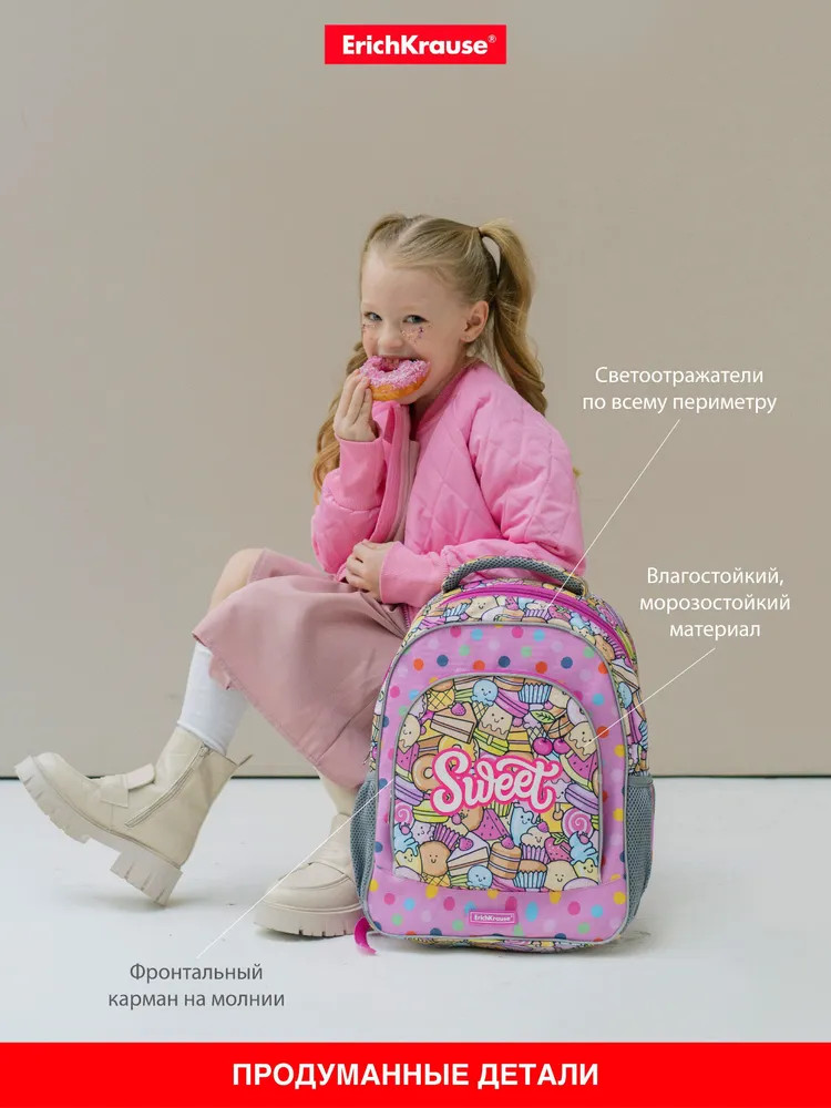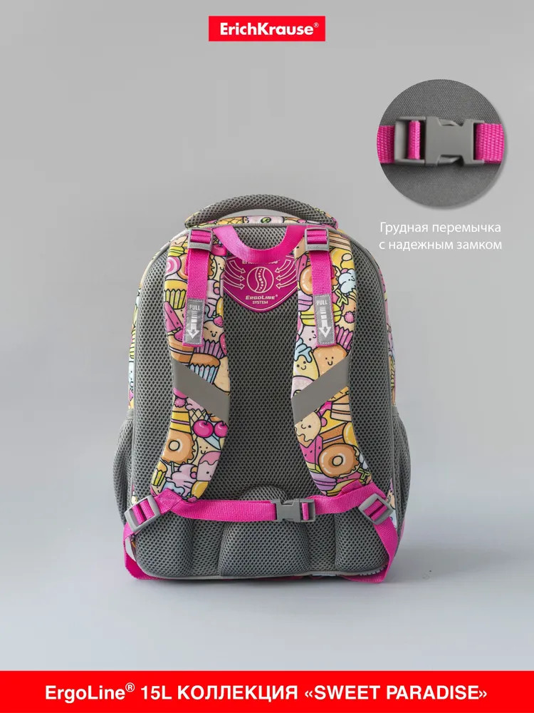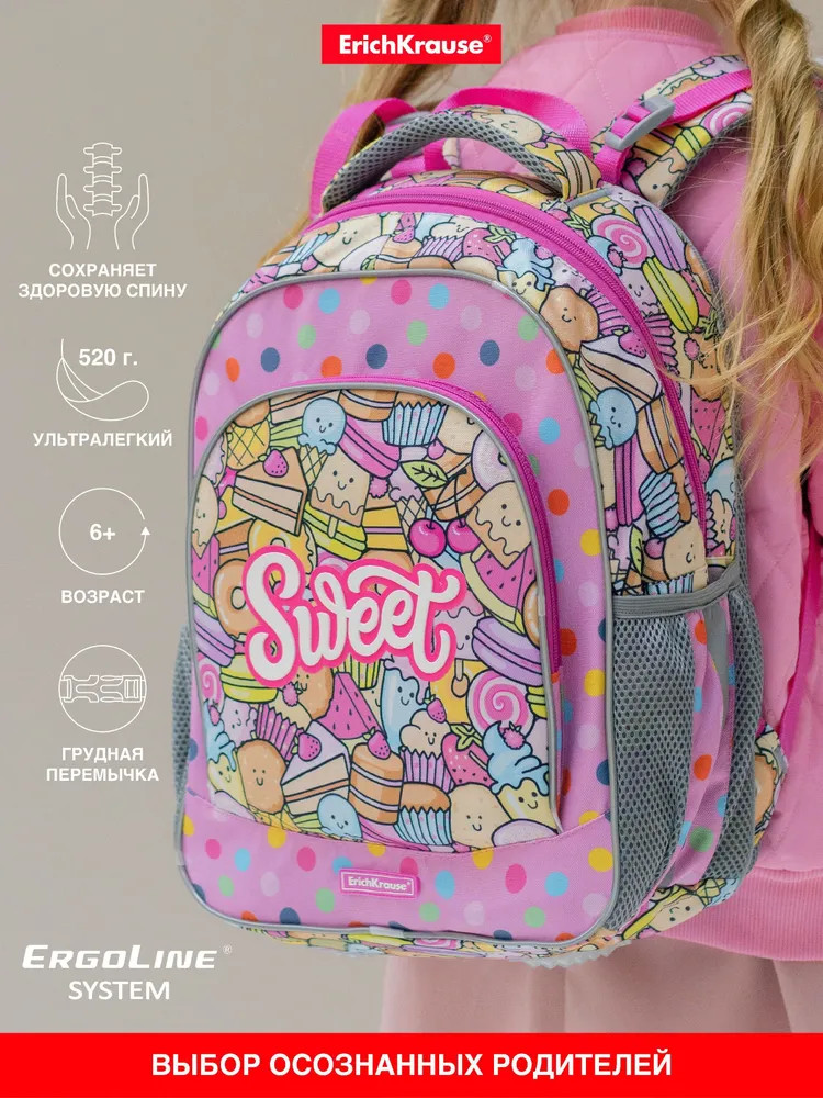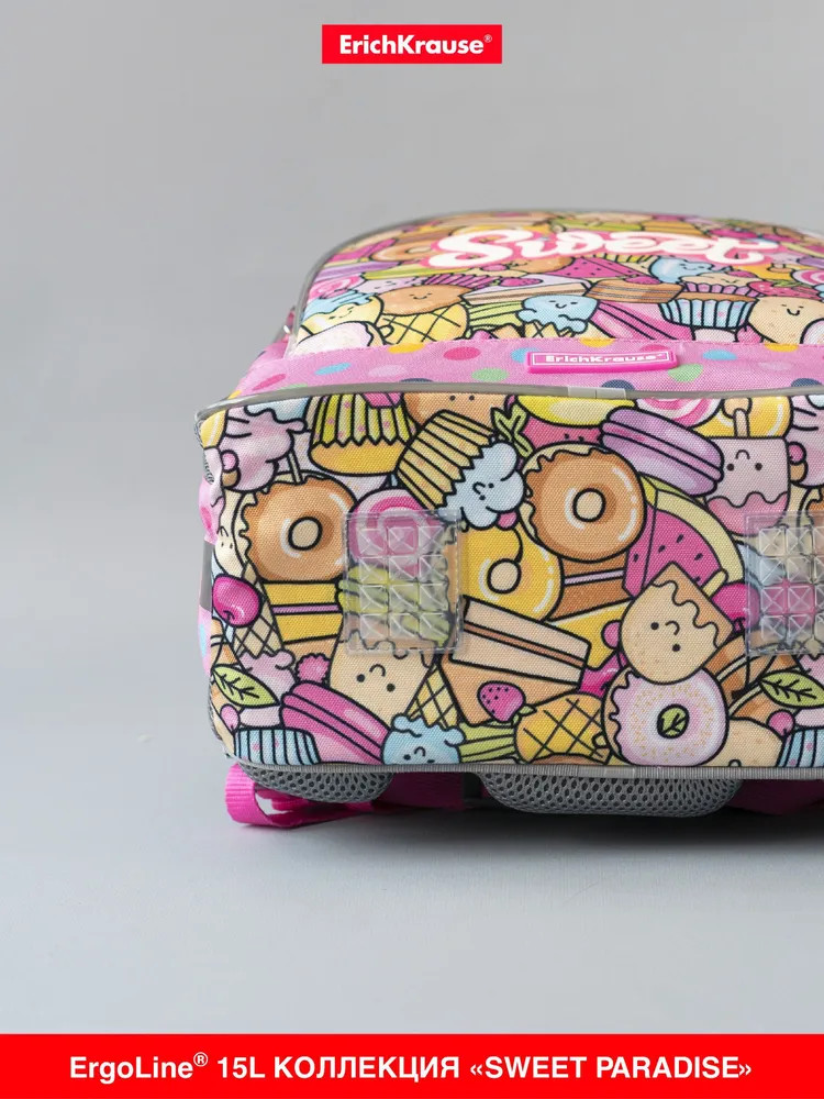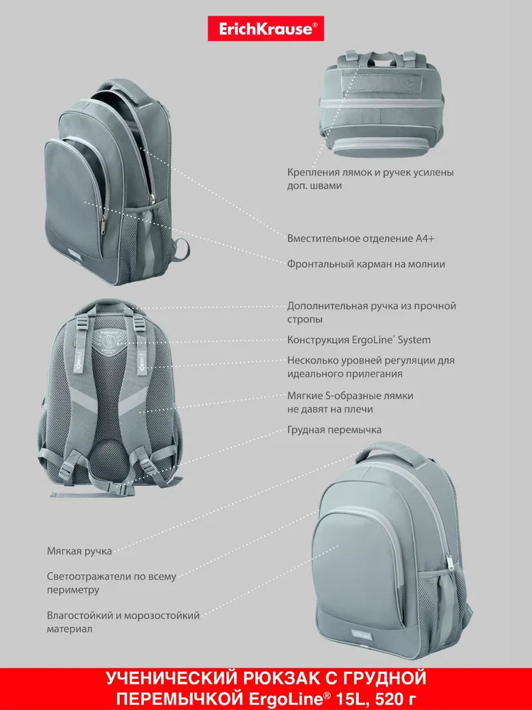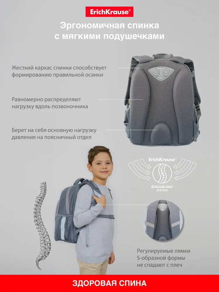 Эргономичная конструкция спинки ErgoLine System из мягких подушечек распределяет вес рюкзака и снижает нагрузку на позвоночник ребёнка. «Дышащая» ткань AirMesh и воздушные каналы между подушечками спинки препятствуют образованию влаги. Мягкие S-образные лямки не давят на плечи, грудная перемычка фиксирует положение рюкзака. Светоотражающие элементы по всему периметру рюкзака. Крепления мягкой объёмной ручки и лямок усилены дополнительными швами из лавсановых нитей. 100% полиэстер оксфорд с полиуретановой пропиткой устойчив к износу и морозу. Пластиковые ножки защищают от загрязнений и влаги.