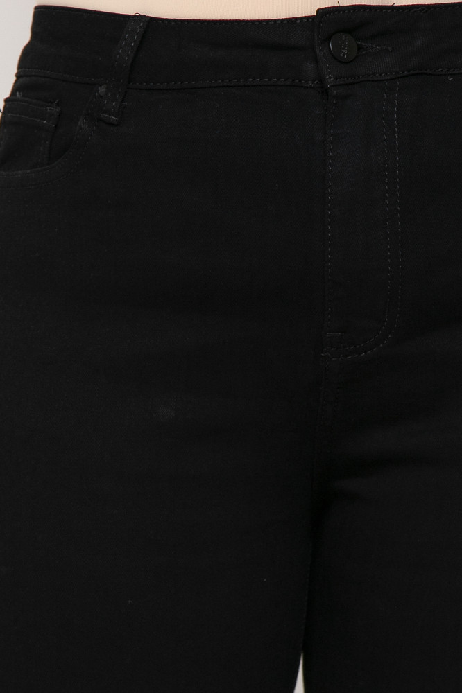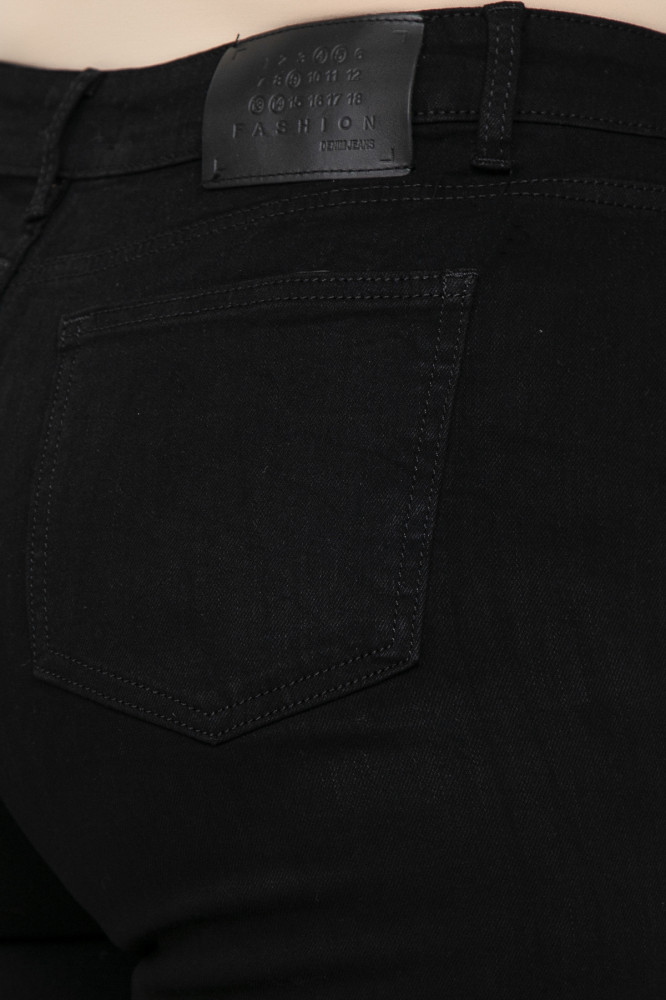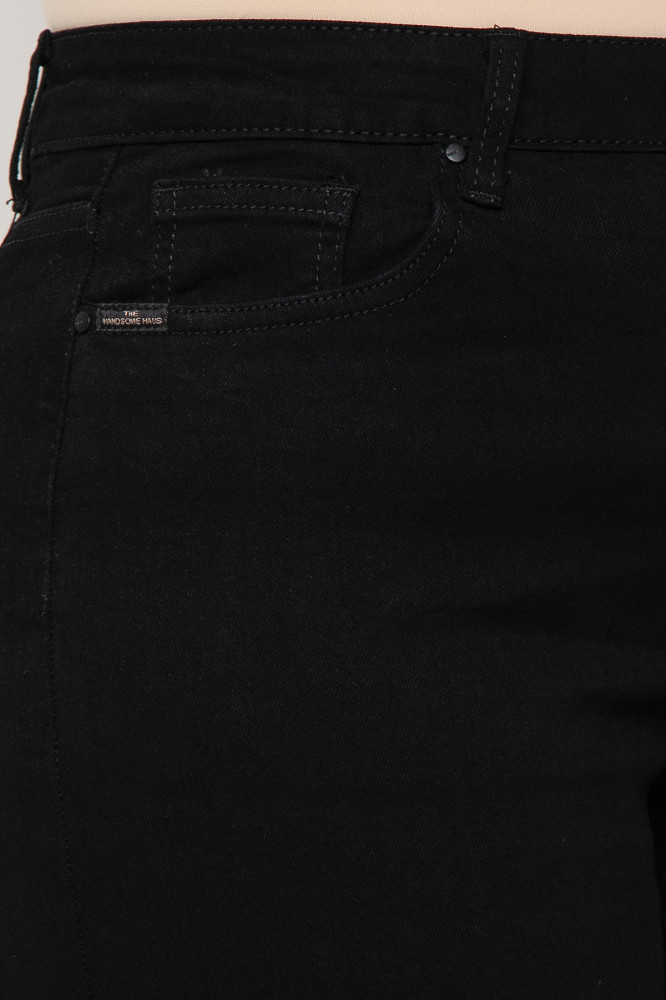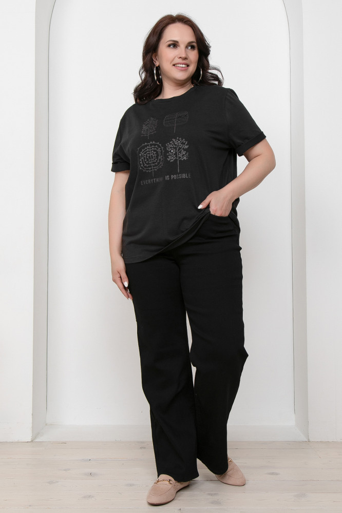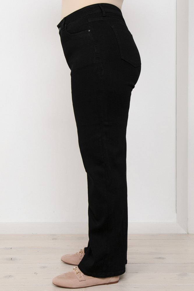 Высокая посадка, удобные. Смотрятся как чёрные брюки, хотя это джинсы. Немного расклешенные к низу. Почти прямые и широкие.