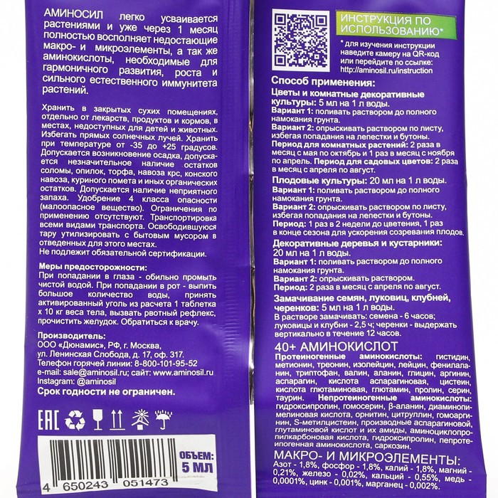 💳 Оплатить за товар можно при получении 🇰🇿 Есть бесплатная доставка по Казахстану от 1 дня 🎁 Копите бонусы с каждой покупки Аминосил легко усваивается растениями и уже через 1 месяц полностью восполняет недостающие макро- и микроэлементы, а так же аминокислоты, необходимые для гармоничного развития, роста и сильного естественного иммунитета растений. Хранить в закрытых сухих помещениях, отдельно от лекарств, продуктов и кормов, в местах, недоступных для детей и животных. Избегать прямых солнечных лучей. Хранить при температуре от 1 до 25 градусов. Допускается возникновение осадка, допускается незначительное наличие остатков соломы, опилок, торфа, навоза крс, конского навоза, куриного помета и иных органических остатков. Допускается наличие неприятного запаха. Удобрение 4 класса опасности (малоопасное вещество). Ограничения по применению отсутствуют. Транспортировка всеми видами транспорта. Освободившуюся тару утилизировать с бытовым мусором в отведенных для этого местах. |