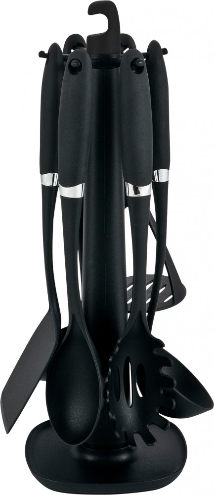 Набор состоит из 7 предметов: картофелемялка, ложка для спагетти, половник для супа, шумовка, лопатка, ложка для соуса, подставка.
