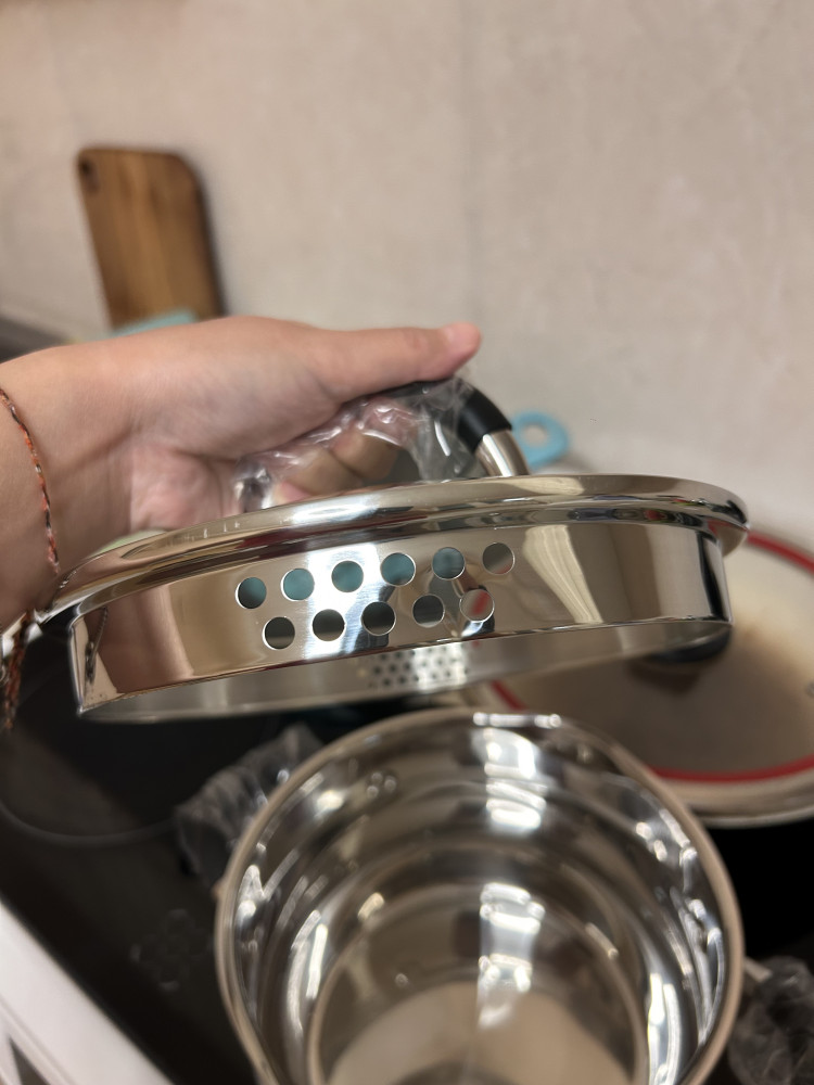 Пишу отзыв после долгого использования, кастрюля огонь 🔥 маленькая как я и хотела, что бы приготовить и хватило на день! Не потемнела сталь, ни каких изменений, как будто только купила! Силиконовые ручки вообще самое лучшее что можно придумать, не обжигает руки, хотя я боялась, тк силикон очень тоненький. Кстати макарошки можно промывать без друшлака тк там в крышке есть отверстия в виде сетки. Очень удобно !!! Можно сливать воду не обживая руки и не используя полотенце для удержания крышки . Отличная кастрюля