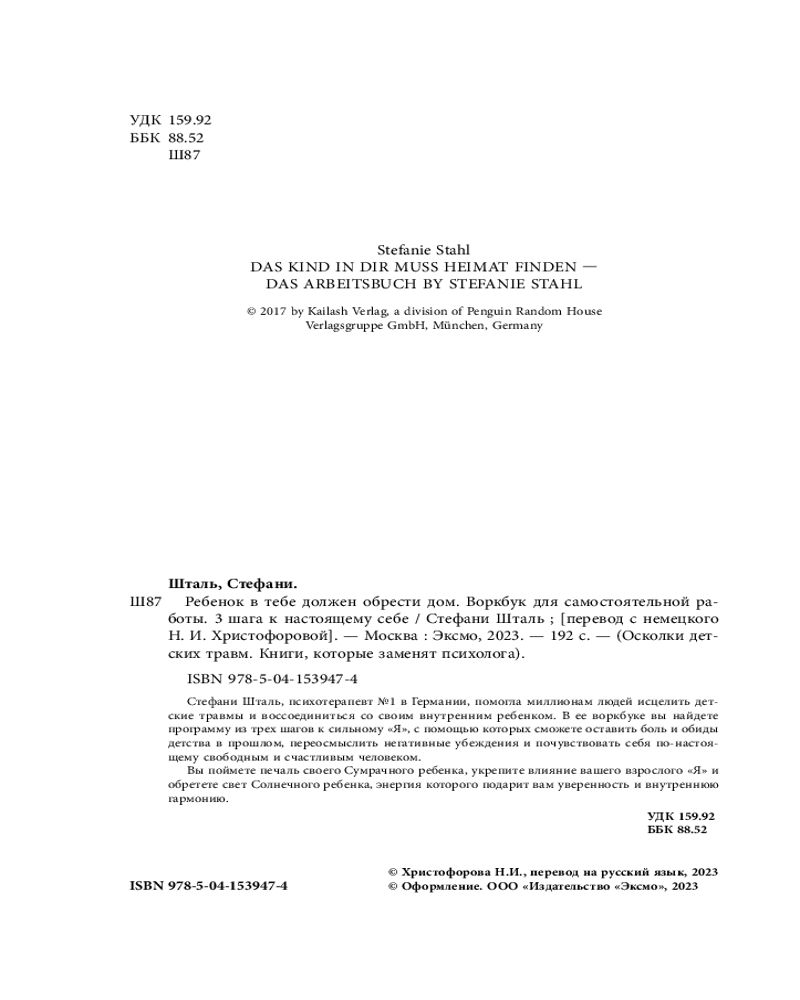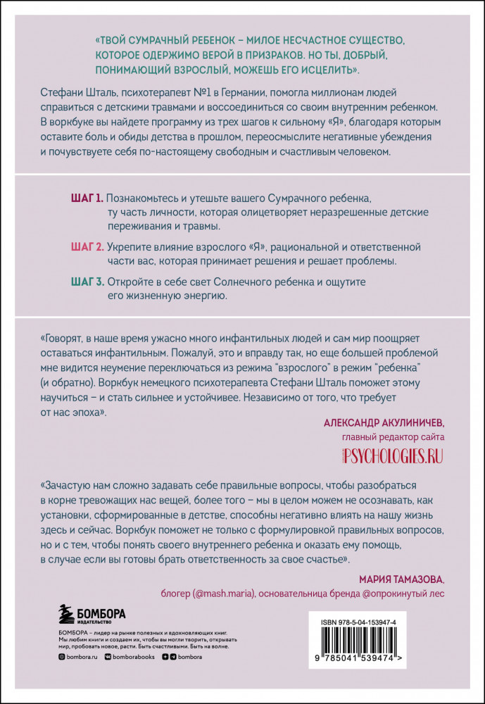💳 Оплатить за товар можно при получении 🇰🇿 Есть бесплатная доставка по Казахстану 🎁 Копите бонусы с каждой покупки Серия: Осколки детских травм. Книги, которые заменят психолога «Твой Сумрачный ребенок — милое несчастное существо, которое одержимо верой в призраков. Но ты, добрый, понимающий взрослый, можешь его исцелить». Стефани Шталь, психотерапевт № 1 в Германии, помогла миллионам людей по всему миру справиться с детскими травмами и воссоединиться со своим внутренним ребенком. Ее воркбук — программа из трех шагов к сильному «Я», благодаря которым вы оставите боль и обиды детства в прошлом, переосмыслите негативные убеждения и почувствуете себя по-настоящему свободным и счастливым человеком. |