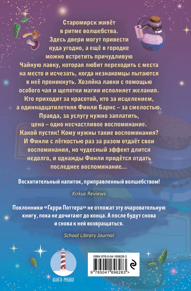 Чайная магияВ данный момент этот товар отсутствует в продаже. Возможно, у нас найдется аналогичный или похожий товар здесь. Серия: Детск. Книги-маяки. Лучшее фэнтези для подростков В маленьком городке Старомирске есть волшебная чайная лавка. Она... живая, то появляется, то исчезает. Ее хозяйка с помощью волшебных чаев исполняет желания. Кто приходит за красотой, кто за силой, а Финли захотела стать смелой. Правда, за услугу нужно заплатить — отдать воспоминание. Но эффект магии длится недолго, и однажды придется отдать последнее воспоминание... |