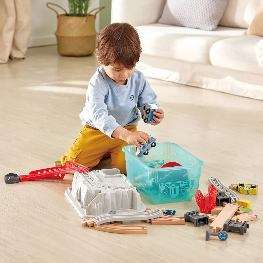Игровой набор от Hape и различные аксессуары к нему предлагают детям новые увлекательные способы учиться с помощью ролевых игр. Начните с создания конфигурации дорожки, показанной на коробке. Затем разыграйте день из жизни оживленного города. Игрушка для пассажирского поезда уже на рельсах, увозя людей на работу и домой, но это не единственный способ путешествовать — в комплекте также есть такси!
