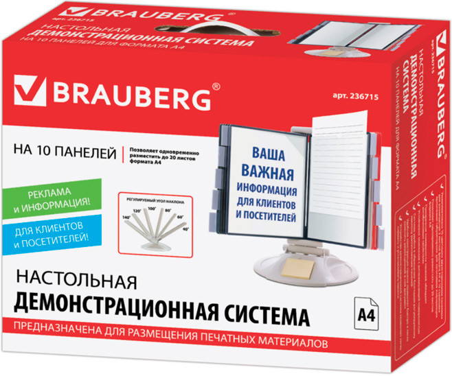 Brauberg Система демонстрационная настольнаяВ данный момент этот товар отсутствует в продаже. Возможно, у нас найдется аналогичный или похожий товар здесь. 10 двухсторонних цветных панелей позволяют разместить одновременно до 20 листов формата А4. Прочные и гибкие литые рамки панелей изготовлены из полипропилена, пригодного для повторной переработки и дальнейшего использования. Демопанели оснащены съемными ярлычками-табуляторами для маркировки и удобного поиска нужной информации. Карман демопанели из прочного прозрачного материала с антибликовым покрытием надежно защитит документы от внешних воздействий. Возможно выставить наиболее удобный угол наклона дисплейного модуля, конкретно для вашего места размещения. Стильный серый цвет пластикового корпуса подойдёт для большинства современных интерьеров. |