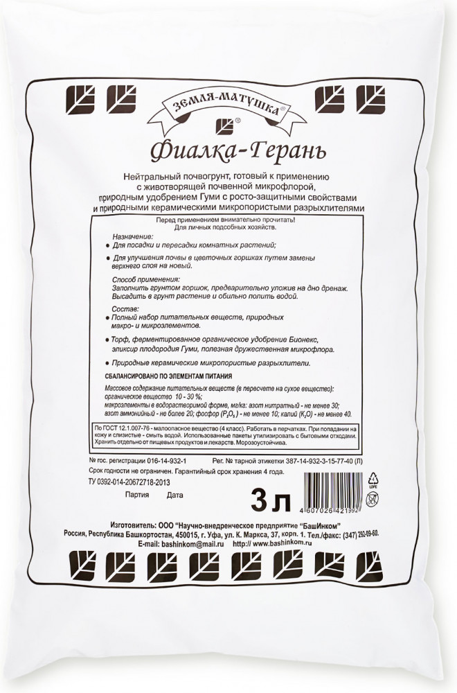 Земля-Матушка Грунт для фиалокВ данный момент этот товар отсутствует в продаже. Возможно, у нас найдется аналогичный или похожий товар здесь. Полностью готовый почвогрунт, состав которого наилучшим образом сбалансирован для посадки и пересадки фиалки, герани, глоксинии, фуксии, гиацинта, аспарагуса. Черноземные почвогрунты «Земля Матушка» оздоровлены природными биопрепаратами фитоспорин и гуми, полезной почвенной микрофлорой; сбалансированы по элементам питания и микроэлементам; обогащены природным гумусным удобрением и природными легкими керамическими разрыхлителями, которые делают почву структурной, высокоплодородной и воздушной. |