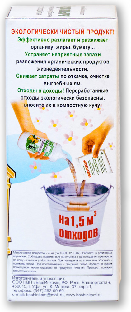 💳 Оплатить за товар можно при получении 🇰🇿 Есть бесплатная доставка по Казахстану от 1 дня 🎁 Копите бонусы с каждой покупки Содержит споры бактерий, способных высвобождать полезные энзимы, расщепляющие отходы. Эффективно разлагает и разжижает органику, фекалии, жиры, бумагу. Устраняет неприятные запахи разложения органических продуктов жизнедеятельности. Снижает затраты по откачке, очистке выгребных ям. Переработанные отходы экологически безопасны. Вносите их в компостную кучу. Безопасен для людей, животных, растений. Выгодно: 0,5 л препарата с биоактиватором (3 пакетика) достаточно для переработки 1,5 м3 содержимого туалета. |