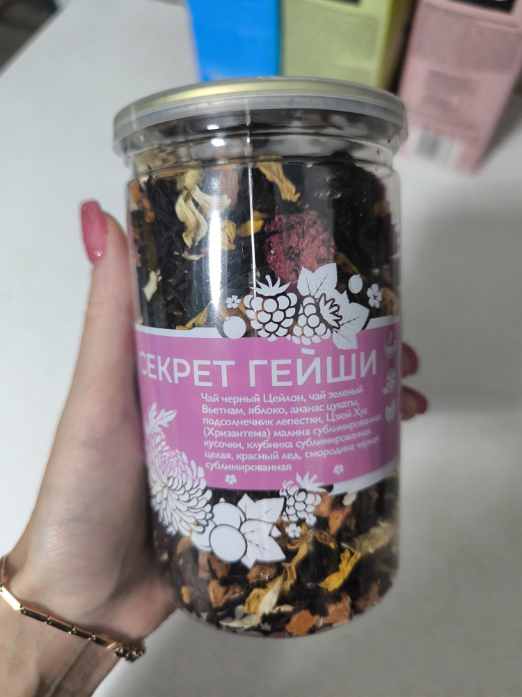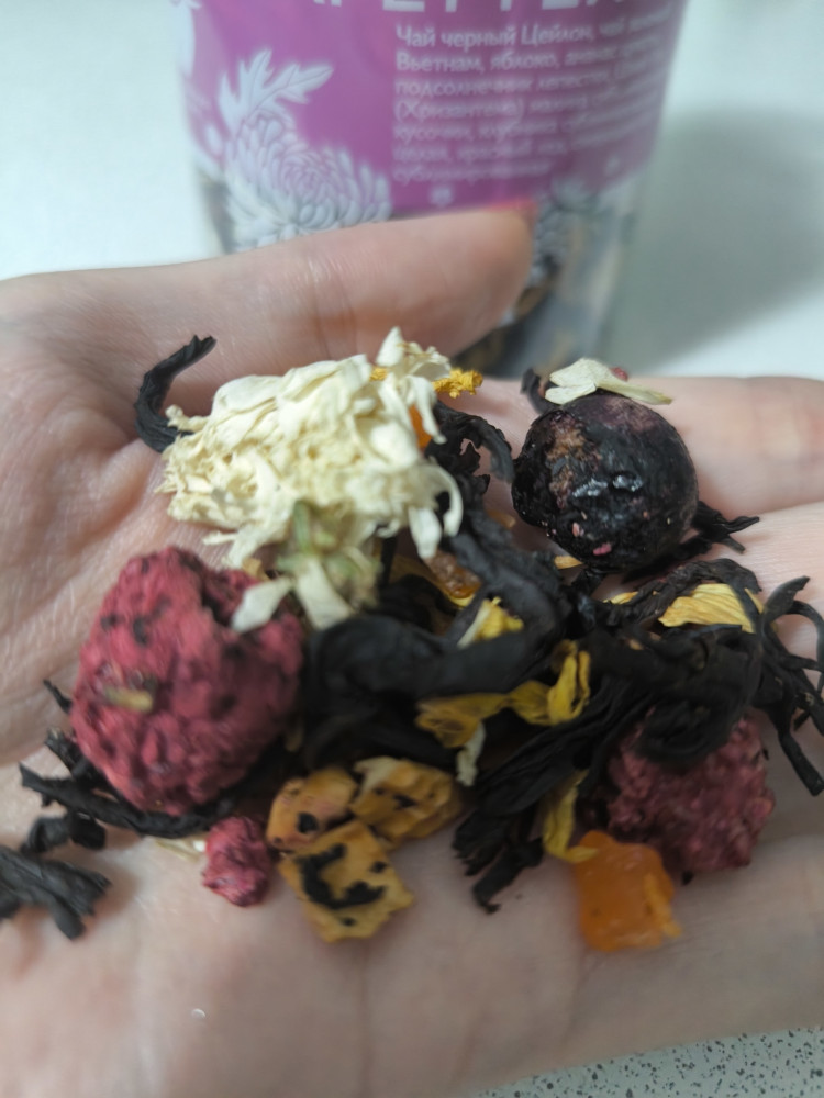 Все составляющие отчётливо видны, крупные, красивый чай. Пахнет сладко, ягодами, цукатами. Вкусно!