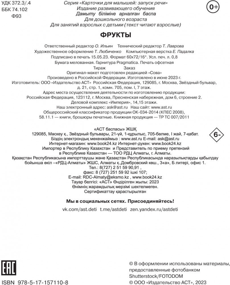 💳 Оплатить за товар можно при получении 🇰🇿 Есть бесплатная доставка по Казахстану от 1 дня 🎁 Копите бонусы с каждой покупки Серия: Карточки для малышей: запуск речи Книга с отрезными карточками «Фрукты» из серии «Карточки для малышей: запуск речи» — идеальный помощник для родителей, которые хотят начать занятия с ребёнком как можно раньше. Благодаря методике известного врача Гленна Домана узнает и запомнит, какие бывают фрукты: яблоко, банан, апельсин, ананас и так далее. Занятия рекомендуется начинать с трёх месяцев: чем младше ребёнок, тем проще и эффективнее обучение. |