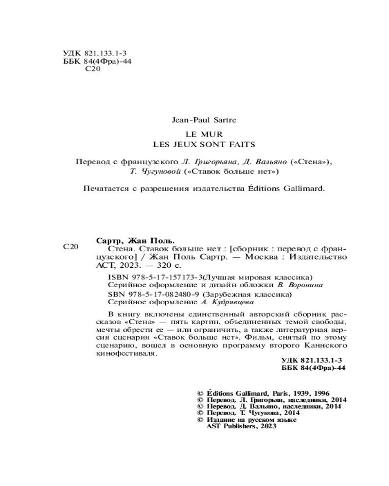 💳 Оплатить за товар можно при получении 🇰🇿 Есть бесплатная доставка по Казахстану от 1 дня 🎁 Копите бонусы с каждой покупки Серия: Лучшая мировая классика В книгу включены единственный авторский сборник рассказов «Стена» — пять картин, объединенных темой свободы, мечты обрести ее — или ограничить, а также литературная версия сценария «Ставок больше нет». Фильм, снятый по этому сценарию, вошел в основную программу второго Каннского кинофестиваля. |