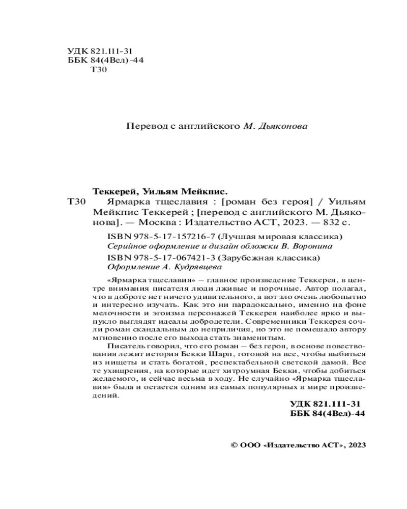 💳 Оплатить за товар можно при получении 🇰🇿 Есть бесплатная доставка по Казахстану 🎁 Копите бонусы с каждой покупки Серия: Лучшая мировая классика «Ярмарка тщеславия» — главное произведение Теккерея, в центре внимания писателя — люди лживые и порочные. Автор полагал, что в доброте нет ничего удивительного, а вот зло очень любопытно и интересно изучать. Как это ни парадоксально, именно на фоне мелочности и эгоизма персонажей Теккерея наиболее ярко и выпукло выглядят идеалы добродетели. Современники Теккерея сочли роман скандальным до неприличия, но это не помешало автору мгновенно после его выхода стать знаменитым. |
