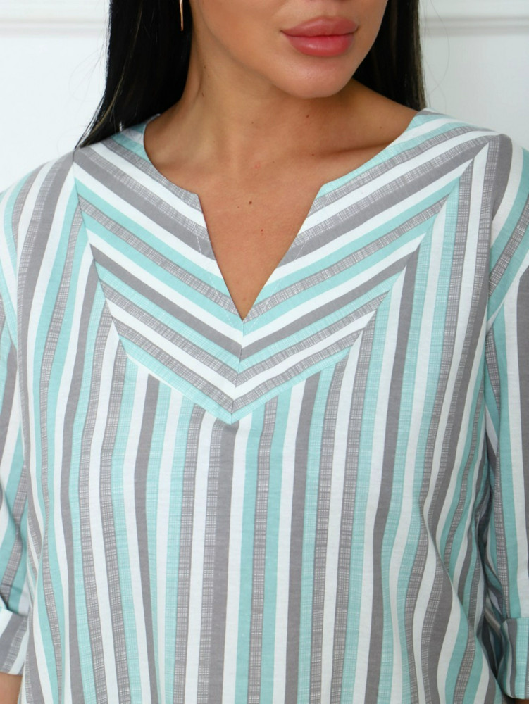 отлично подошла по размеру и удобно села по фигуре...ткань плотная..приятная к телу... яркие синие полоски...мне понравилась