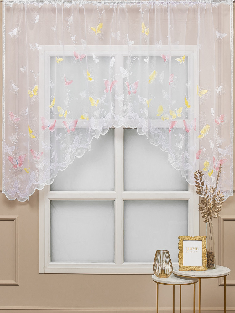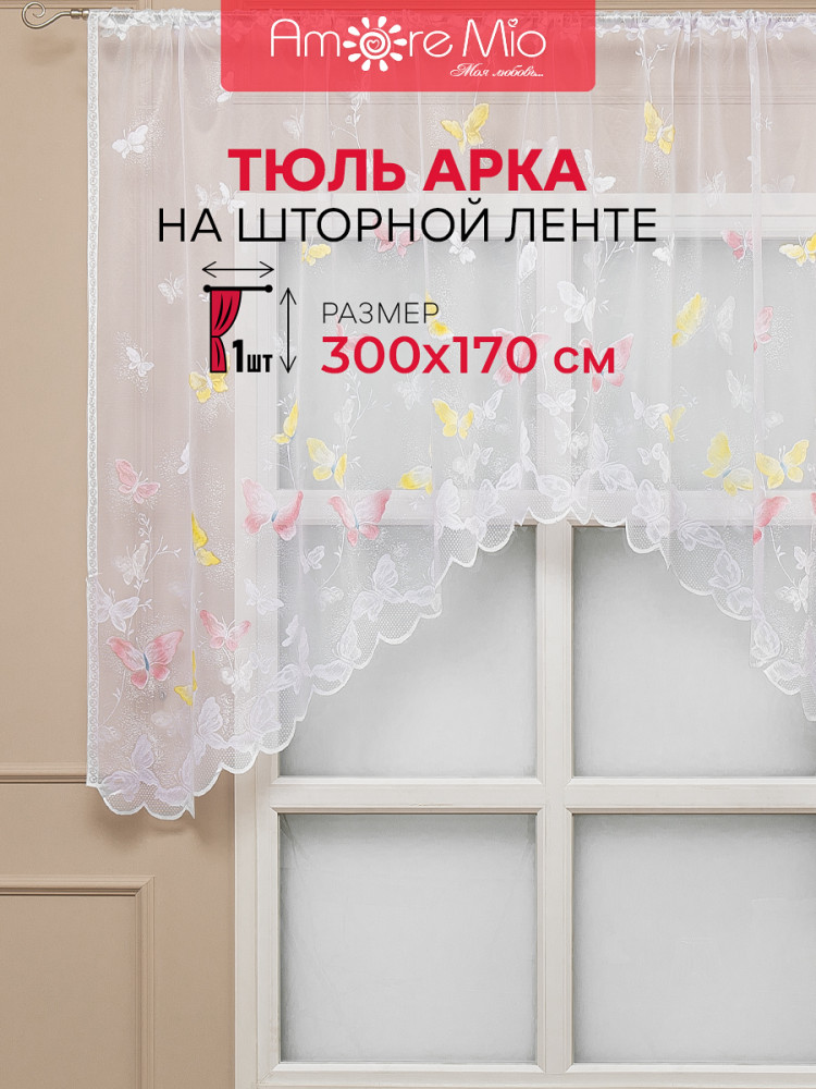 Тюлевая арка для кухни торговой марки «Amore Mio» — изготовлена из мелкой сетки и украшена изящным жаккардовым рисунком. Изделие будет прекрасно смотреться в любом интерьере. Благодаря полукруглой форме и красиво оформленному низу, штора расширит пространство небольшой кухни и откроет доступ к подоконнику.