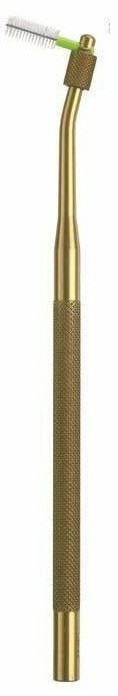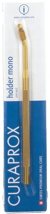 Держатель для ершиков Curaprox UHS412 предназначен для фиксирования ершиков при чистке межзубных промежутков. Держатель Curaprox UHS 412 выполнен из алюминия, ручка покрыта противоскользящим покрытием, что сводит к минимуму вероятность травмирования десен и ротовой полости. Рифлёная поверхность не позволяет держателю проворачиваться в руке во время чистки. Фиксирующие гайки прочно закрепляют ершик в ручке.
