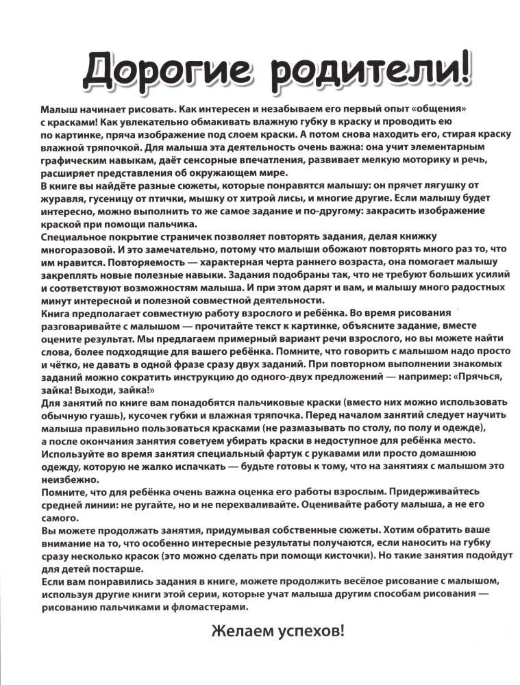 1+ Спрячь мышку! Рисование губкойВ данный момент этот товар отсутствует в продаже. Возможно, у нас найдется аналогичный или похожий товар здесь. Серия: Новый ребенок (обложка) Эта книга поможет приобщить малыша к интересному и полезному занятию - рисованию. Крохе понравится обмакивать влажную губку в краску и проводить ею по картинке, «пряча» изображение под слоем краски. А потом снова «находить» его, стирая краску влажной тряпочкой. В книге вы найдете сюжеты, которые понравятся малышу, а специальное покрытие страничек позволяет повторять задания, делая книжку многоразовой. |
