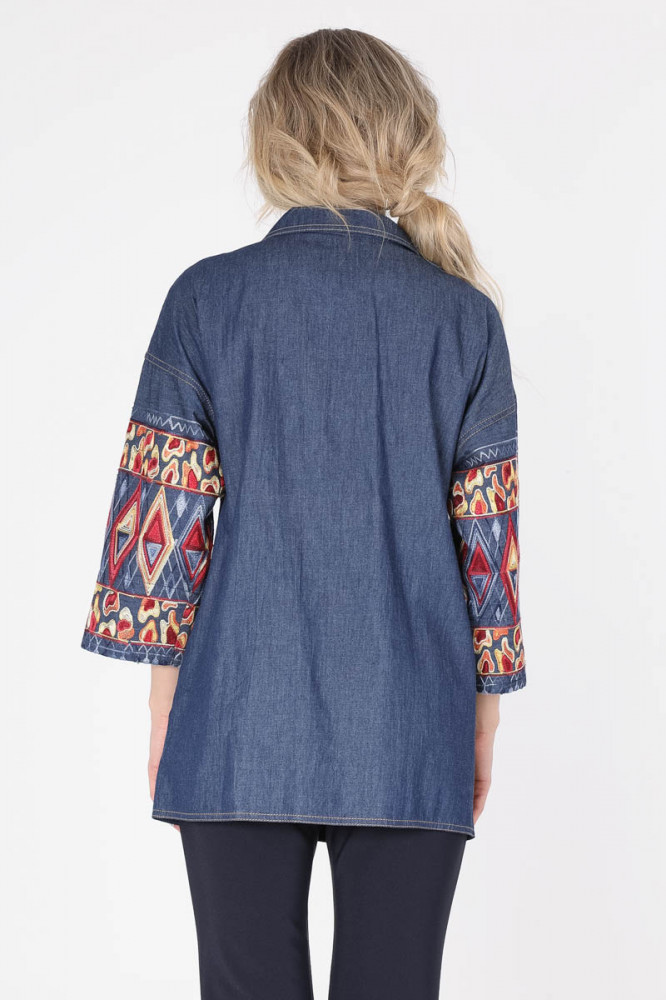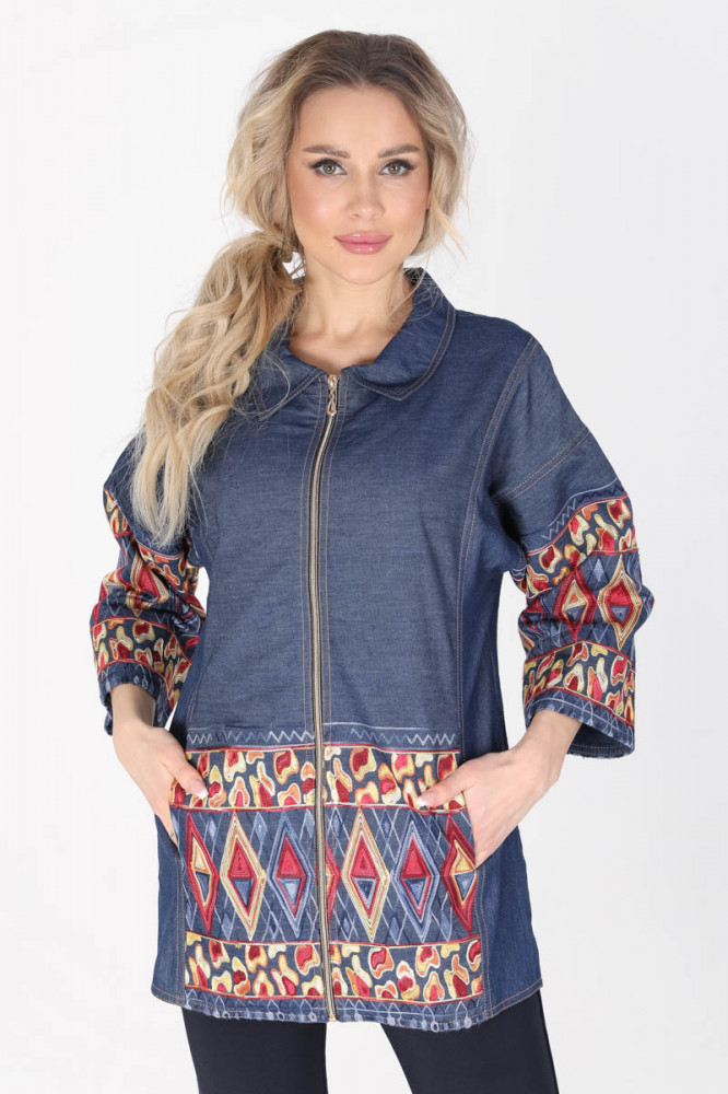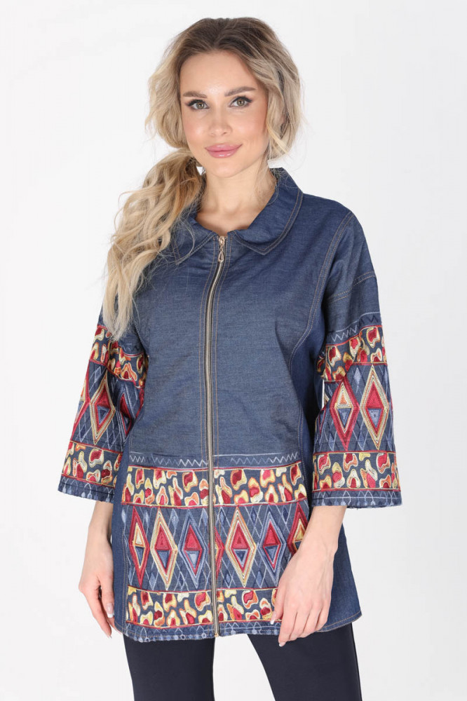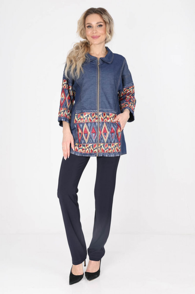 Думала это "джинса", но это тонкая ткань под "джинсу",идет размер в размер.Этнический рисунок вышит,смотрится красиво(красный).Особого восторга нет,но оставила.