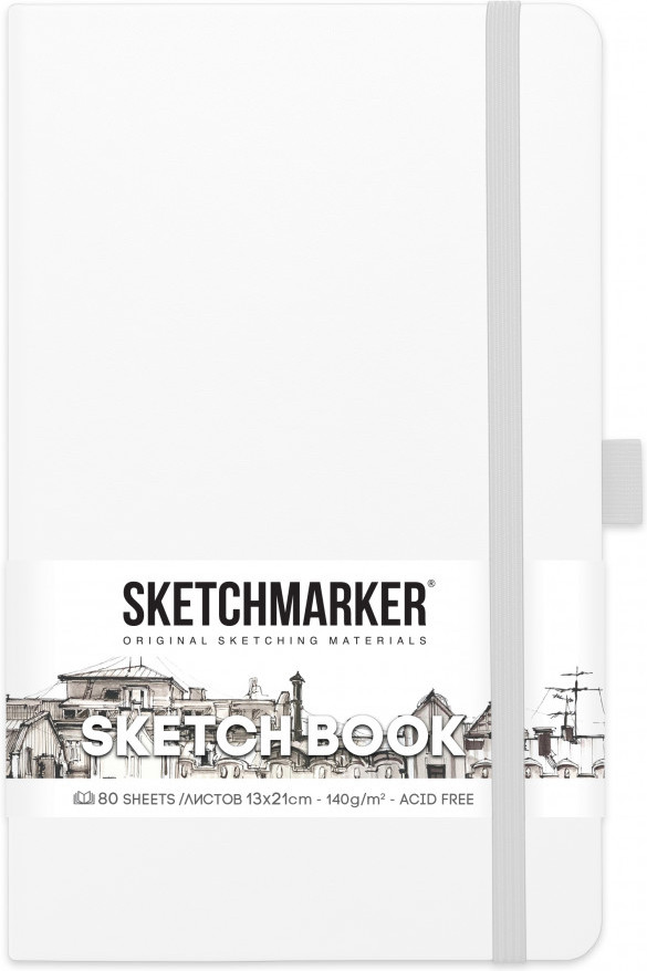 В твердой обложке скетчбука Sketchmarker 80 листов бумаги теплого белого оттенка, без линовки. Бумага гладкая, с едва ощутимой фактурой, плотностью 140 г/м, произведена из 100% целлюлозы и отлично выдерживает исправления.