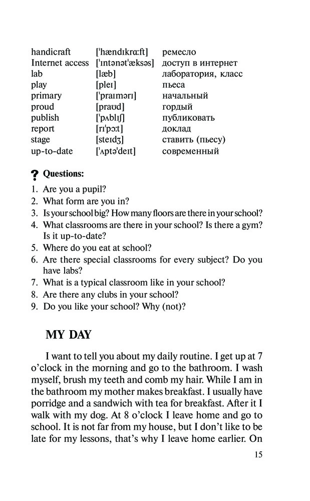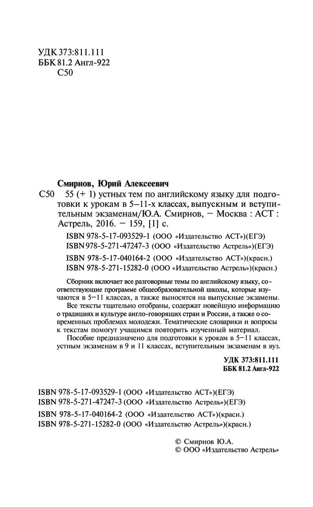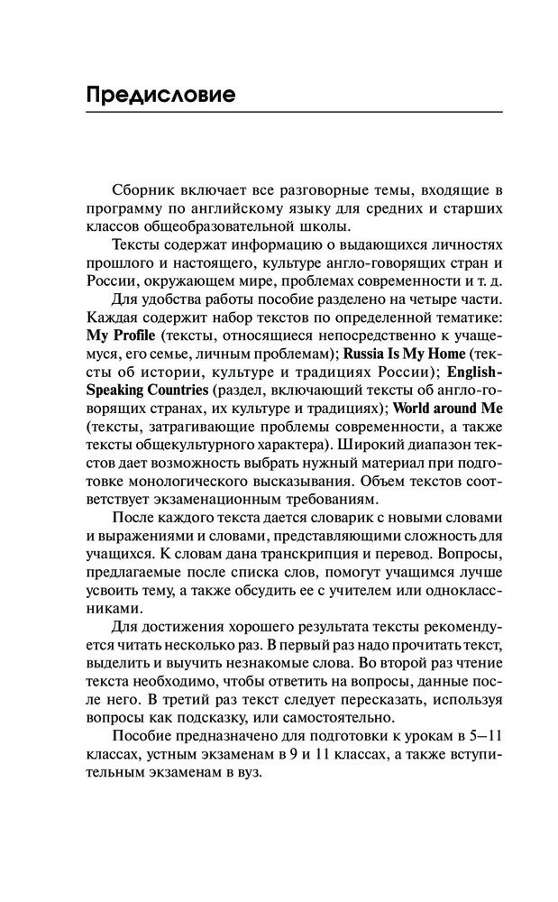 Сборник включает все разговорные темы по английскому языку, соответствующие программе общеобразовательной школы, которые издаются в 5–11 классах, а также выносятся на выпускные экзамены. Все тексты тщательно отобраны, содержат новейшую информацию о традициях и культуре англо-говорящих стран и России, а также о современных проблемах молодежи. Тематические словарики и вопросы к текстам помогут учащимся повторить изученный материал. Пособие предназначено для подготовки к урокам в 5–11 классах, устным экзаменам в 9 и 11 классах, вступительным экзаменам в вуз.