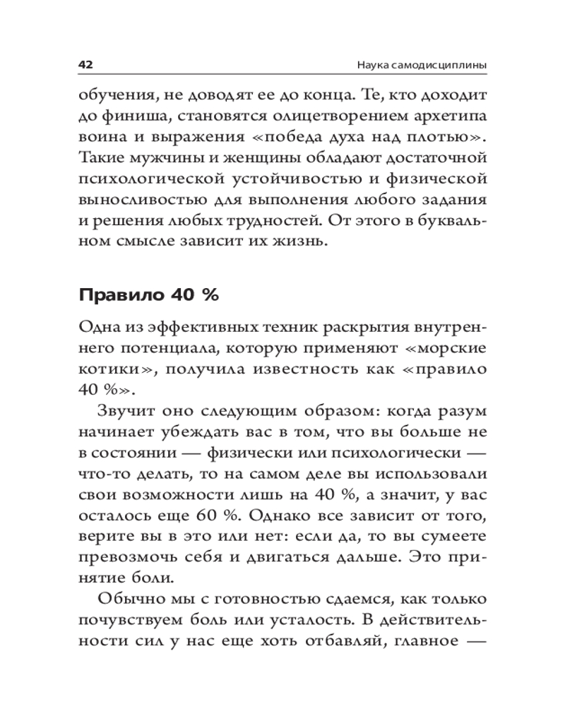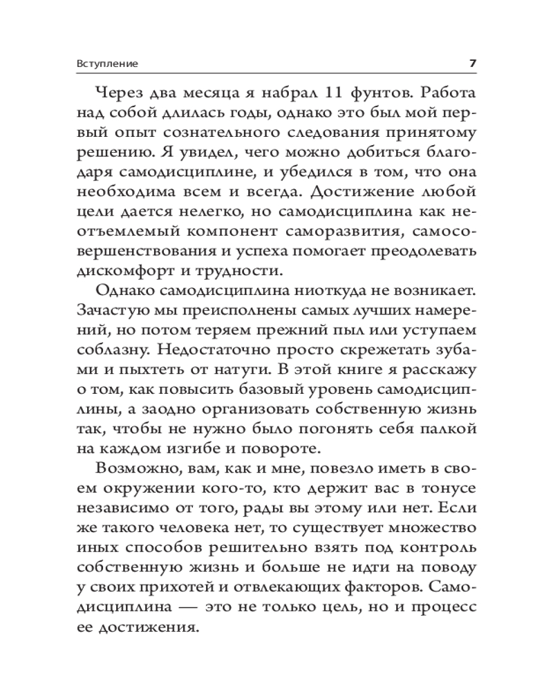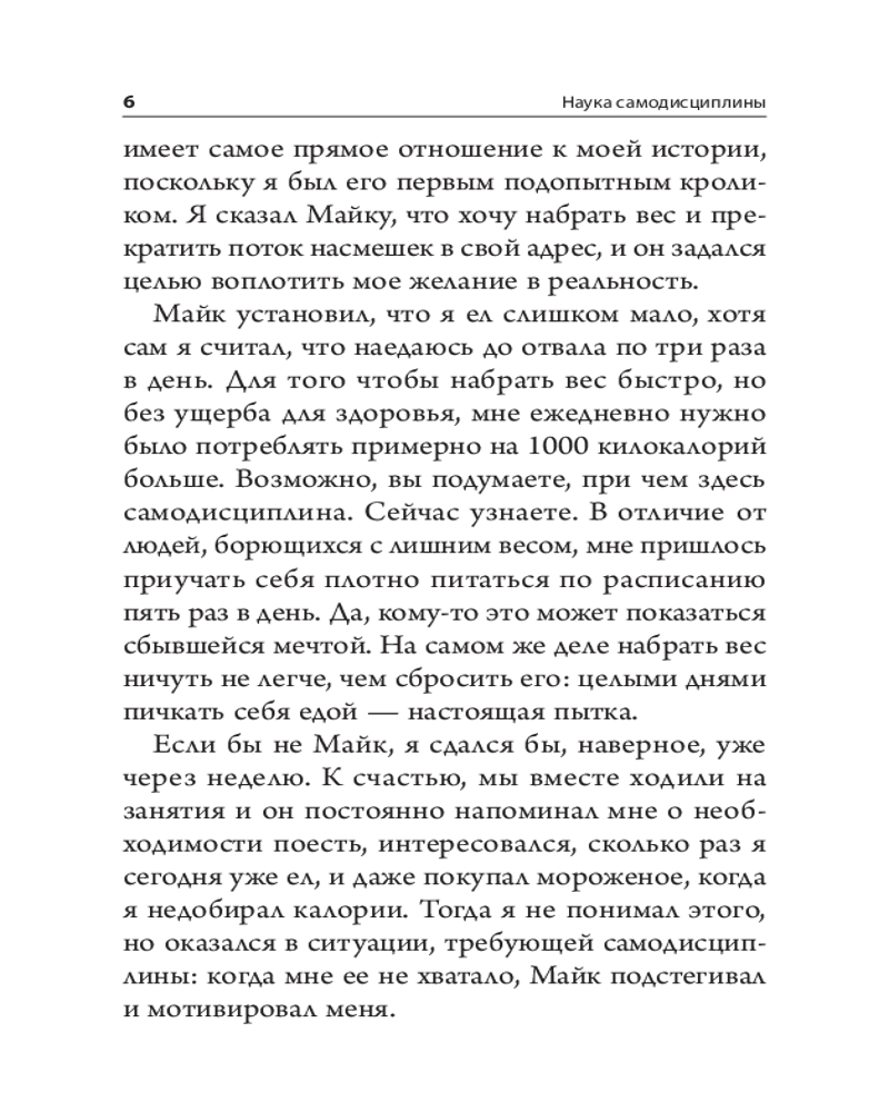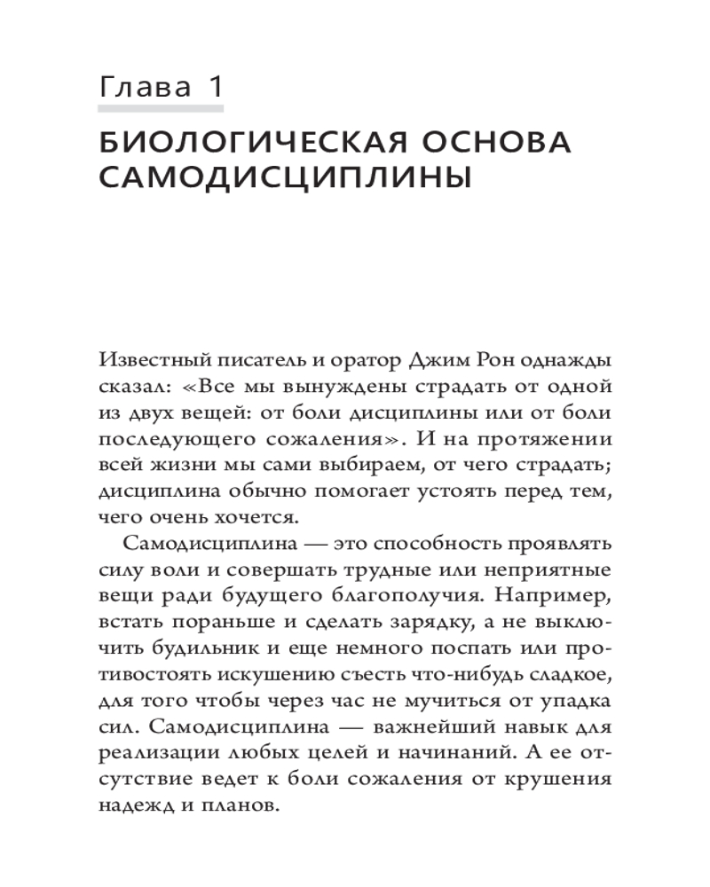 «Наука самодисциплины» — это не просто книга. Это дорожная карта человеческой психики, которая кардинально изменит вашу жизнь. Когда вы поймете истинные причины своих импульсивных желаний и истоки силы воли, то сможете справиться с временным дискомфортом и сфокусироваться на том, что действительно важно. Питер Холлинс, практикующий психолог с большим опытом, просто и доходчиво объясняет, почему, поставив крест на сиюминутных отговорках, оправданиях, искушениях и лени, вы сможете рассчитывать на гораздо большие призы в будущем.