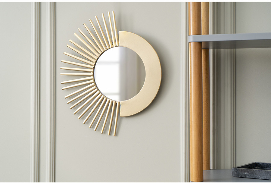 Зеркало настенное lys привнесет свежую ноту в оформление помещения и станет заметным акцентом в интерьере спальни, прихожей или гостиной. Аксессуар имеет прочную и надежную раму из железа. Золотистый оттенок латуни и элементы, напоминающие солнечные лучи, создают волшебный визуальный образ, наполняющий пространство уютом и теплом. За счет универсального цветового решения зеркало великолепно смотрится как на светлой, так и на темной стене. |