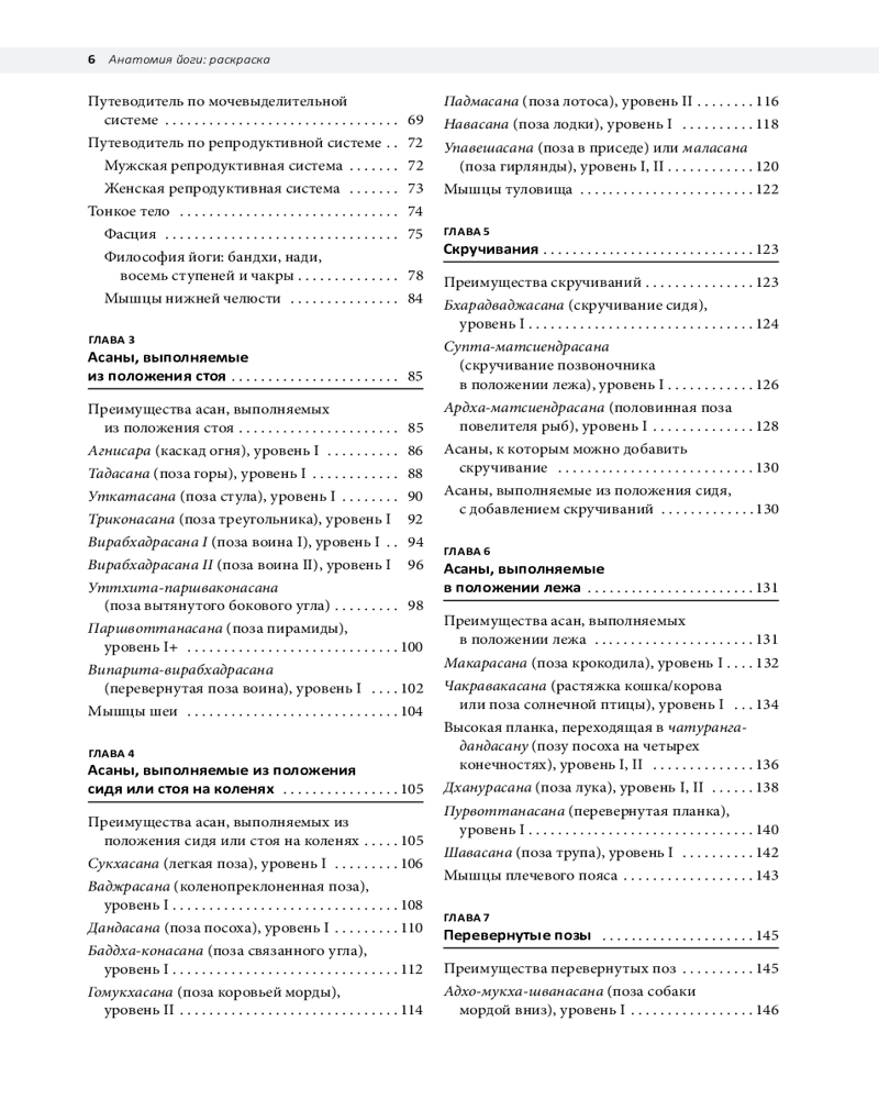 В главах 3–9 представлено более 50 популярных асан, сгруппированных по семи ключевым категориям. Для каждой позы даются подсказки и рекомендации по выполнению, а также указания по раскрашиванию связанных с ней анатомических структур. Читатели узнают не только о пользе каждого упражнения, но и о возможных противопоказаниях и корректировке.