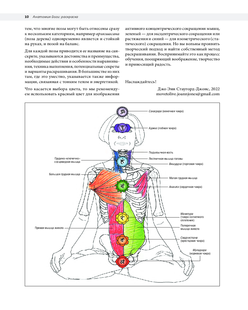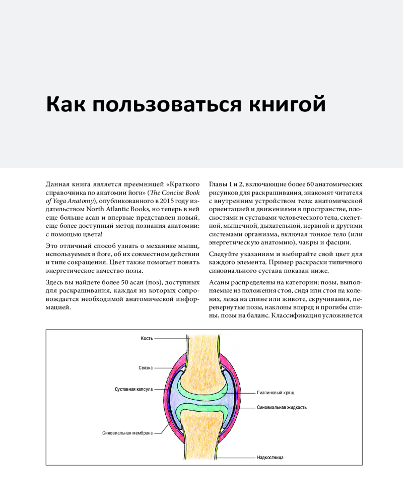 По мере раскрашивания вы будете узнавать, какие мышцы активизируются в тех или иных позах и что происходит в суставах. Эта книга станет для всех ценителей йоги интерактивным обучающим инструментом, позволяющим углубить знания об анатомических и механических структурах, важных для занятий йогой.
