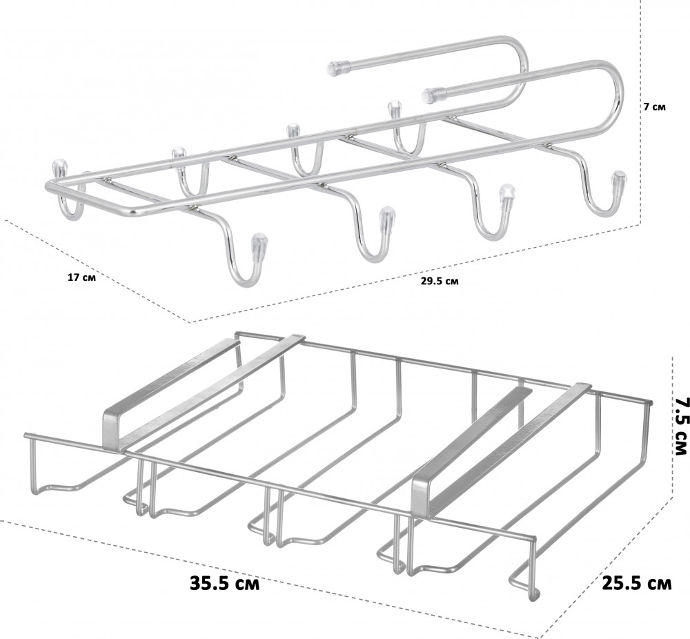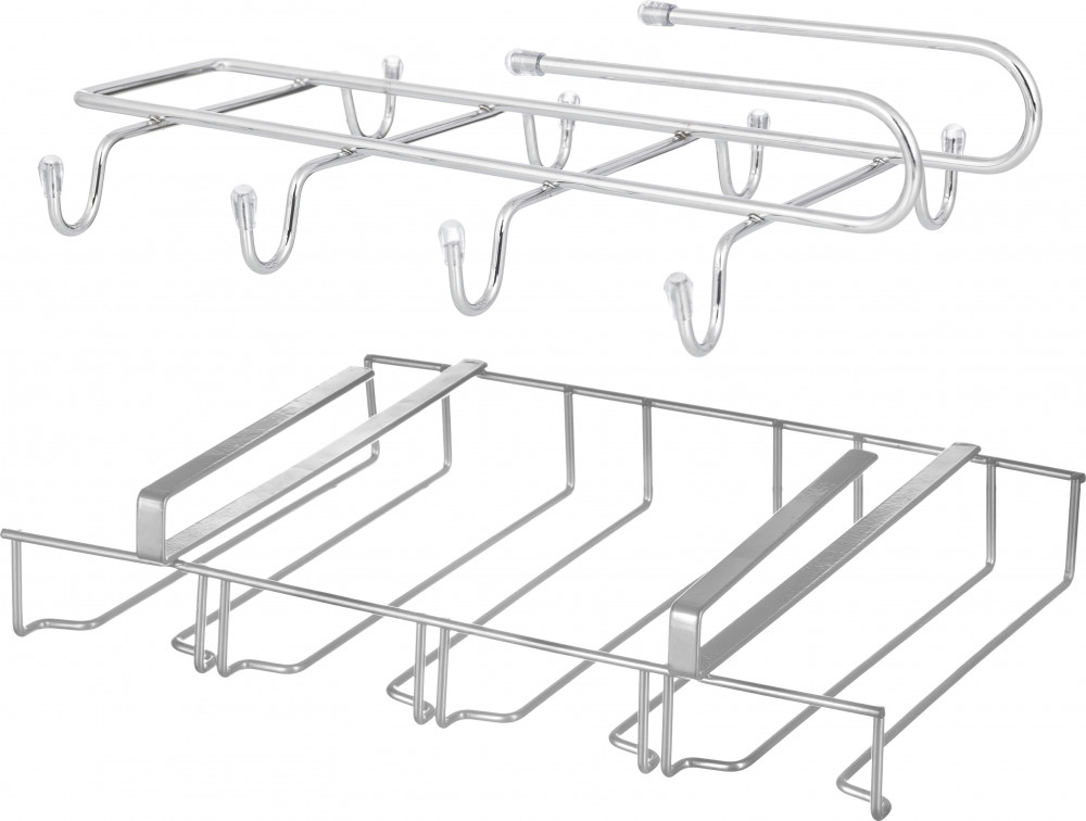 💳 Оплатить за товар можно при получении 🇰🇿 Есть бесплатная доставка по Казахстану от 1 дня 🎁 Копите бонусы с каждой покупки Держатель кружек рассчитан на толщину полки 3 см. Имеет 8 крючков для кружек. Также подойдет для для хранения сумок, ремней и многих других вещей. Держатель бокалов рассчитан на толщину полки 2 см. Имеет 4 секции длиной по 22 см. Подходит для хранения бокалов с подставкой диаметром от 3,5 до 7,5 см. Металлические органайзеры можно размещать как внутри шкафа, так и снаружи. Хорошо смотрятся и экономят место. Такой набор поможет превратить хранимую посуду в украшение вашей кухни. |
