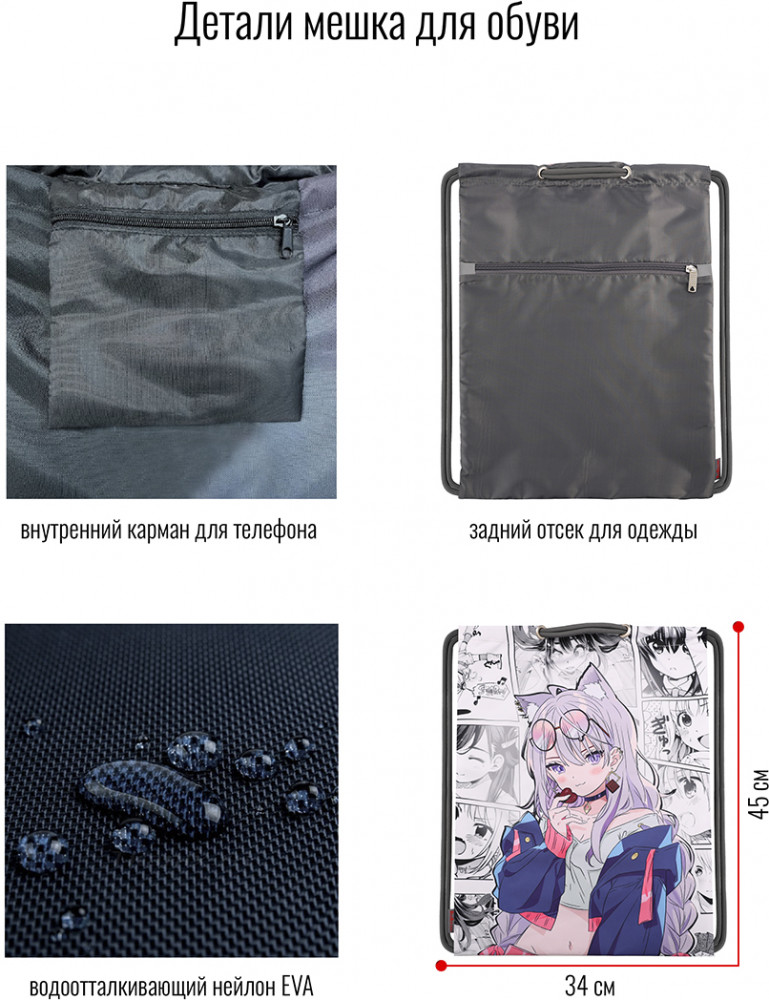 Основное отделение затягивается толстыми шнуром, которые дополнительно выполняют функцию лямок, внешний карман застегивается на молнию. Мешок имеет внутренний карман на молнии для мелочей и телефона. Мешок-рюкзак удобно носить на плече или как рюкзак на спине, а также за ручку. Для безопасного использования в любое время суток, мешок дополнен светоотражающими элементами, которые обеспечивает безопасность в условиях недостаточного освещения, сделают его видимым на дорогах в свете автомобильных фар. Мешки для обуви бренда BagRio с модными принтами составят комплект к школьным ранцам и пеналам.