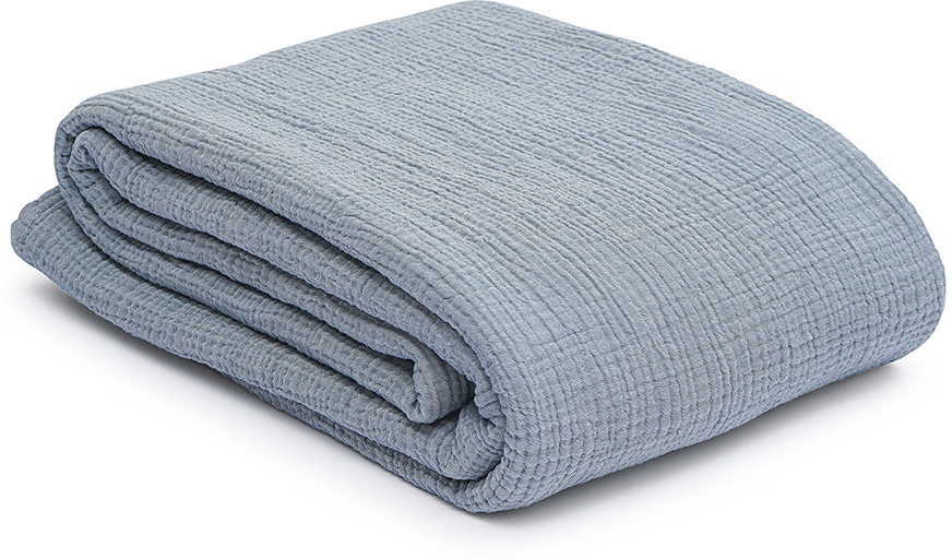 Покрывало двухсторонее из многослойного муслина джинсово-синего цвета из коллекции Essential сделает интерьер спальни уютным и подарит чувство комфорта при использовании. Легкий, дышащий материал на основе экологичного хлопкового волокна приятный на ощупь, хорошо впитывает влагу, не электризуется и не вызывает аллергию. За счет специального переплетения нитей в каждом из четырех слоев ткань имеет интересную фактуру, обладает высокой плотностью, устойчивостью к износу, не скатывается и хорошо держит форму. Элегантная простота муслинового покрывала позволяет вписать его в различные стилевые решения интерьера: сканди, кантри, прованс, эклектика, бохо, эко, минимализм и другие.