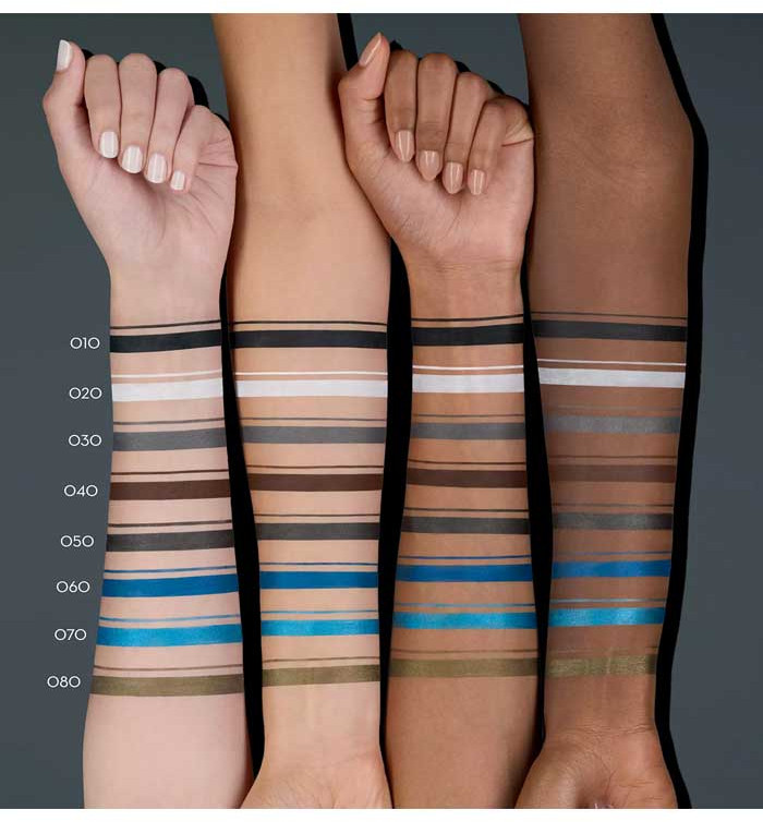 Размазывается, отпечатывается на верхнем веке. Обычный карандаш среднего качества.