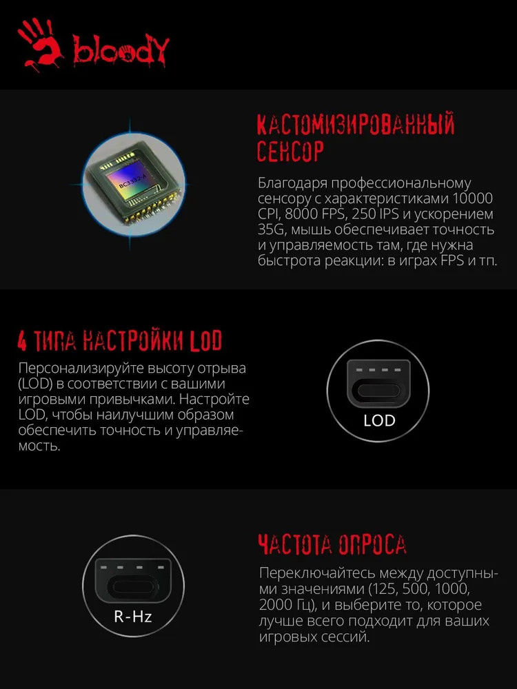 Благодаря профессиональному сенсору с характеристиками 10000 CPI, 8000 FPS, 250 IPS и ускорением 35g, мышь обеспечивает точность и управляемость там, где нужна быстрота реакции: в играх FPS и тп.