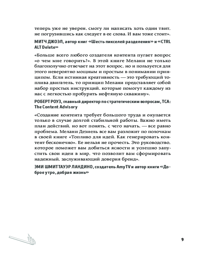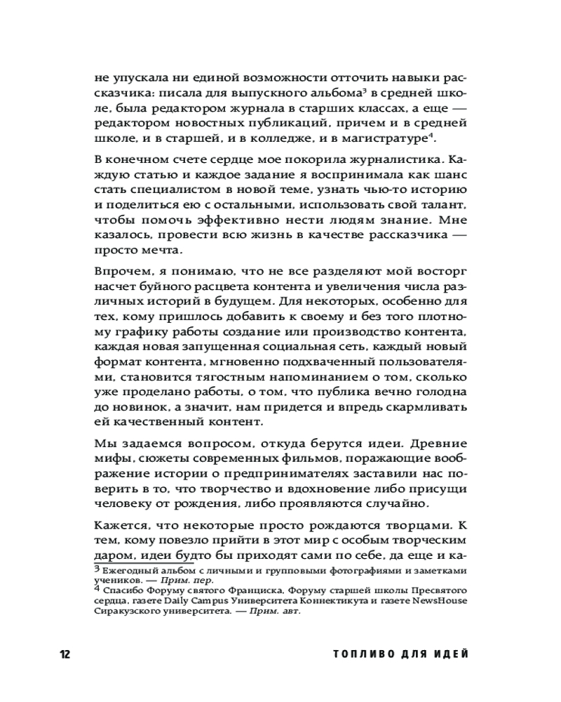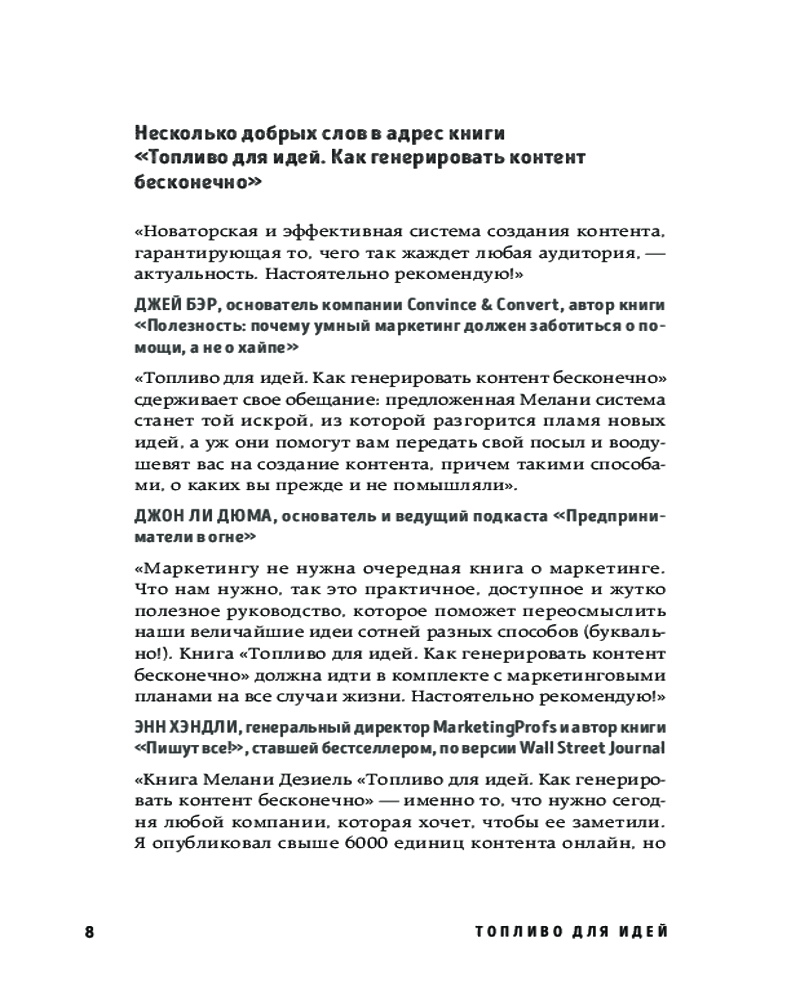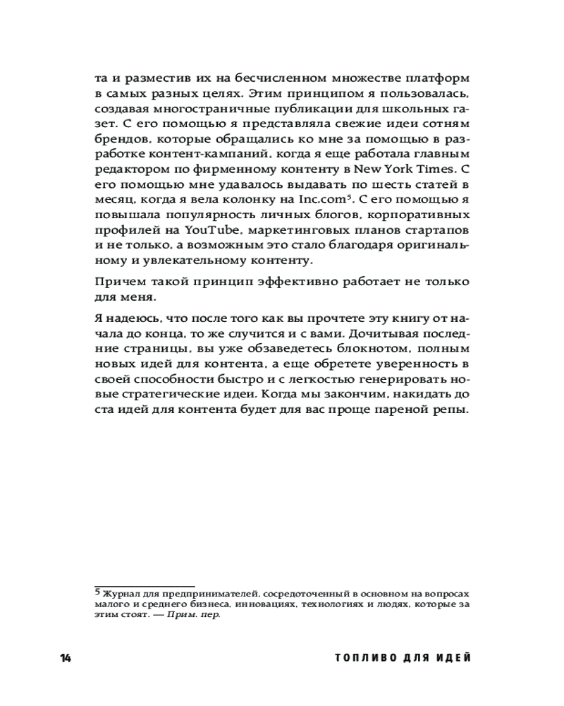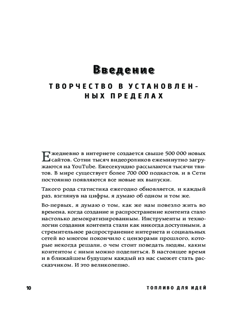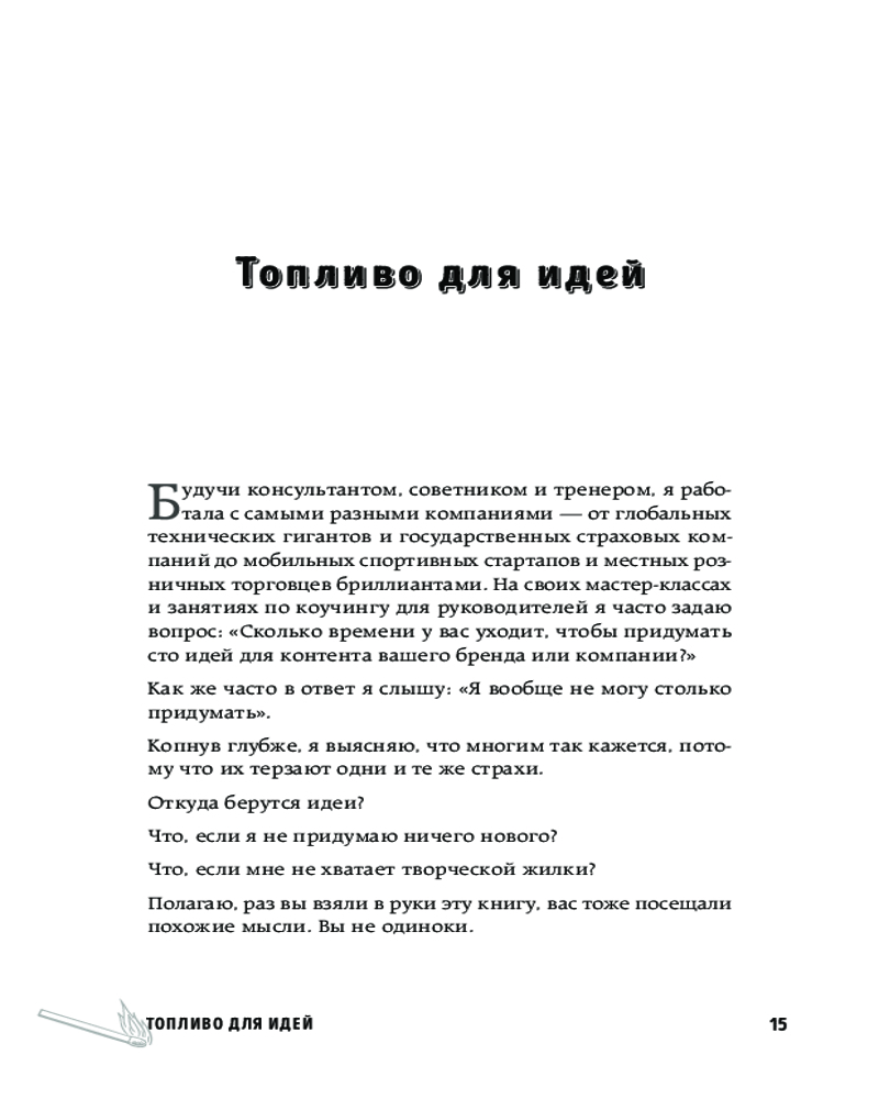 Как обеспечить бесперебойный поток идей? Можно ли забыть о страхе чистого листа? И можно ли прокачать креативную мышцу? Еще как можно! «Топливо для идей. Как генерировать контент бесконечно» — это простая, но рабочая структура, которая делает генерацию идей легкой и регулярной. Неважно, чем именно вы занимаетесь — пишете роман или сценарий фильма, снимаете рекламу или вайн, продвигаете блог или раскручиваете нового рэп-исполнителя, — главное, знать, как достучаться до аудитории. И в этом поможет формула «Акцент + Формат».